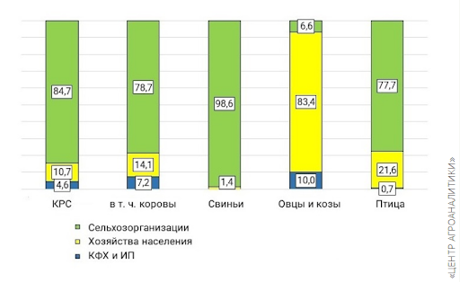 Вклад сельскохозяйственных организаций в суммарный объем производства мяса составил 95,1%. На долю крестьянско-фермерских хозяйств и сельских предпринимателей пришлось 4,45% и 0,5% соответственно.
