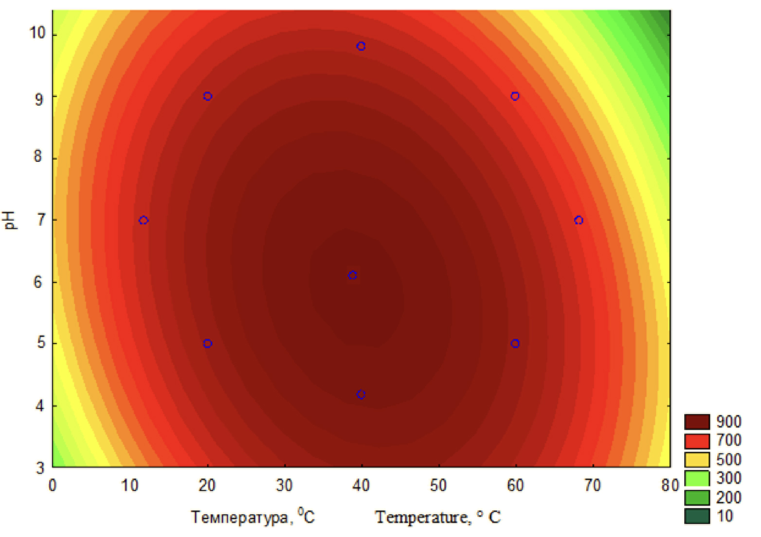 Диаграмма зависимости активности препарата мТг от уровня рН и температуры [6]