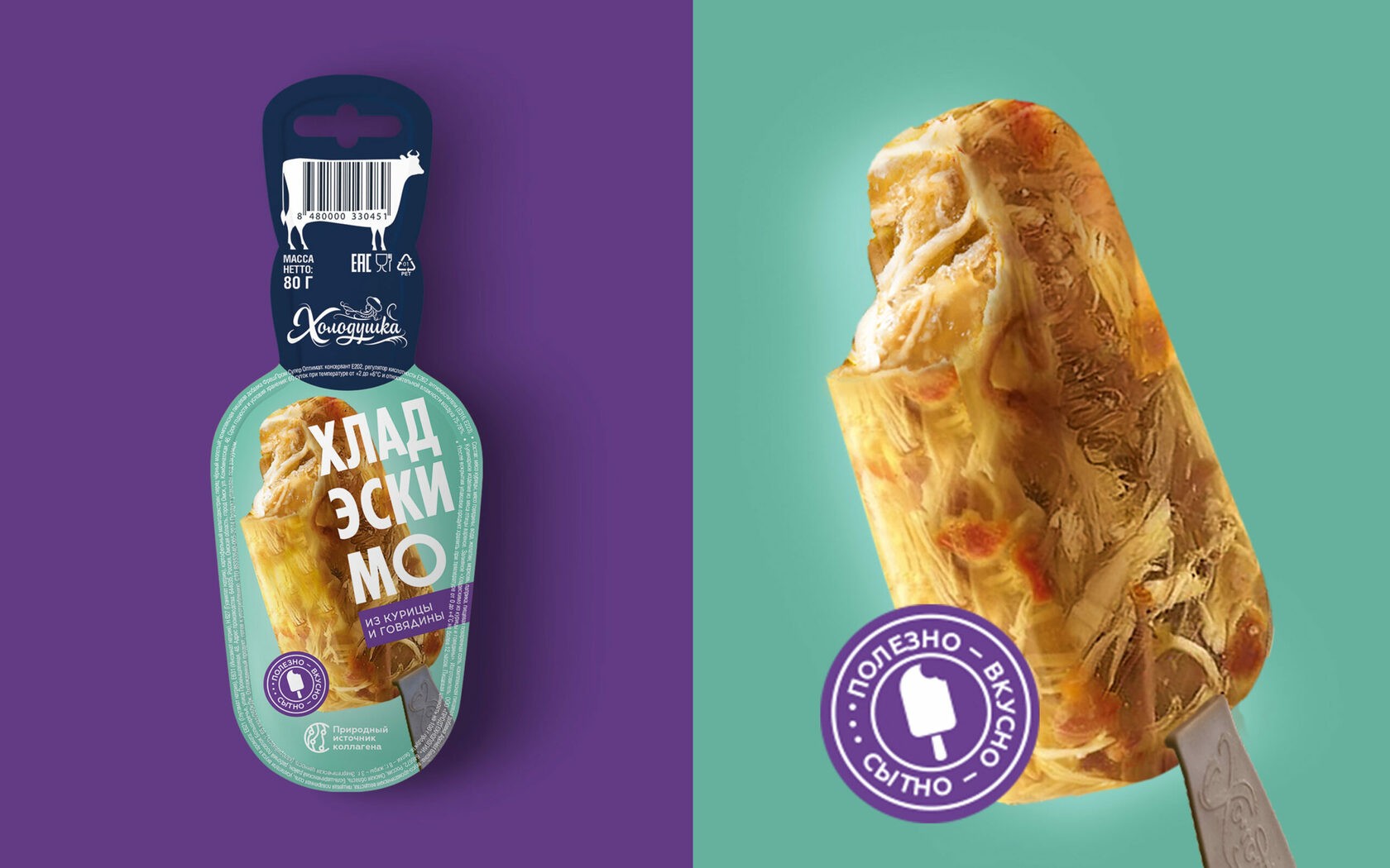 Сибирский холодец будут продавать в упаковках в форме мороженого. Отраслевой портал Unipack представил дизайн упаковки холодца от московского агентства Getbrand для омского ООО «ПРОДТЕХНОЛОГИИ» (ТМ «Холодушка»). Линейка «ХладЭскимо» — это холодец в виде хорошо знакомого нам с детства мороженого на палочке. Заказчик поставил задачу разработать нестандартное и в то же время хорошо понятное потребителю решение, которое транслирует вкус, натуральный состав, пользу продукта и вызывает ощущение сытости. Так появилась идея создать холодец в форме эскимо.