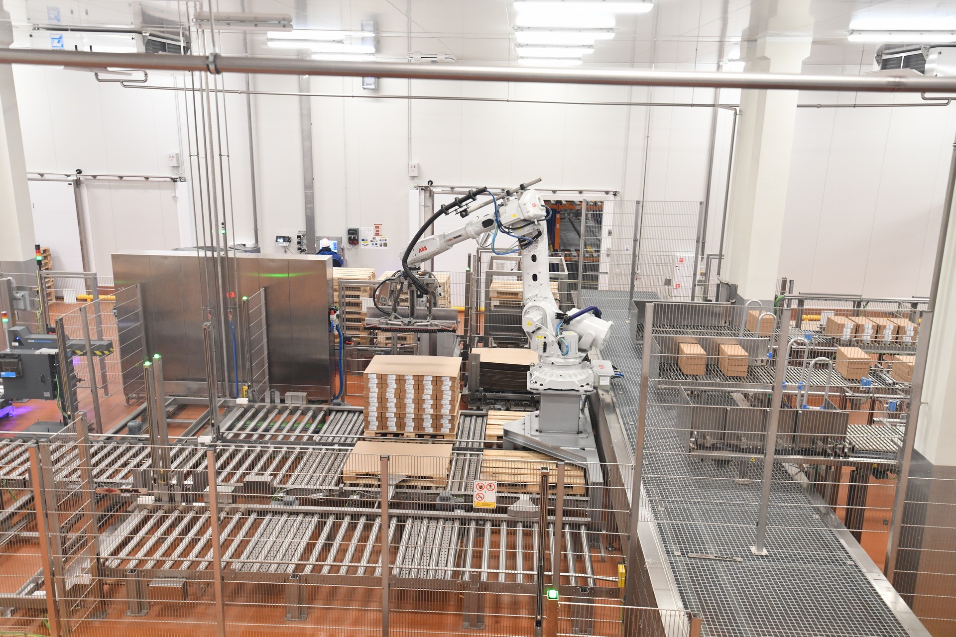 Но мы отвлеклись. А тем временем Антонио Хрешич показал, как дельта-пикеры (аппараты с манипуляторами, закрепленными на нескольких подвижных стержнях) укладывают батоны колбасы в картонные шоу-боксы, которые заклеиваются. А уже специальный робот палетайзер собирает шоу-боксы в штабель, устанавливает их на паллеты, заматывает в стретч-пленку, еще раз взвешивает и маркирует. Когда паллета загружена, ее увозят на автопогрузчике работники склада готовой продукции.