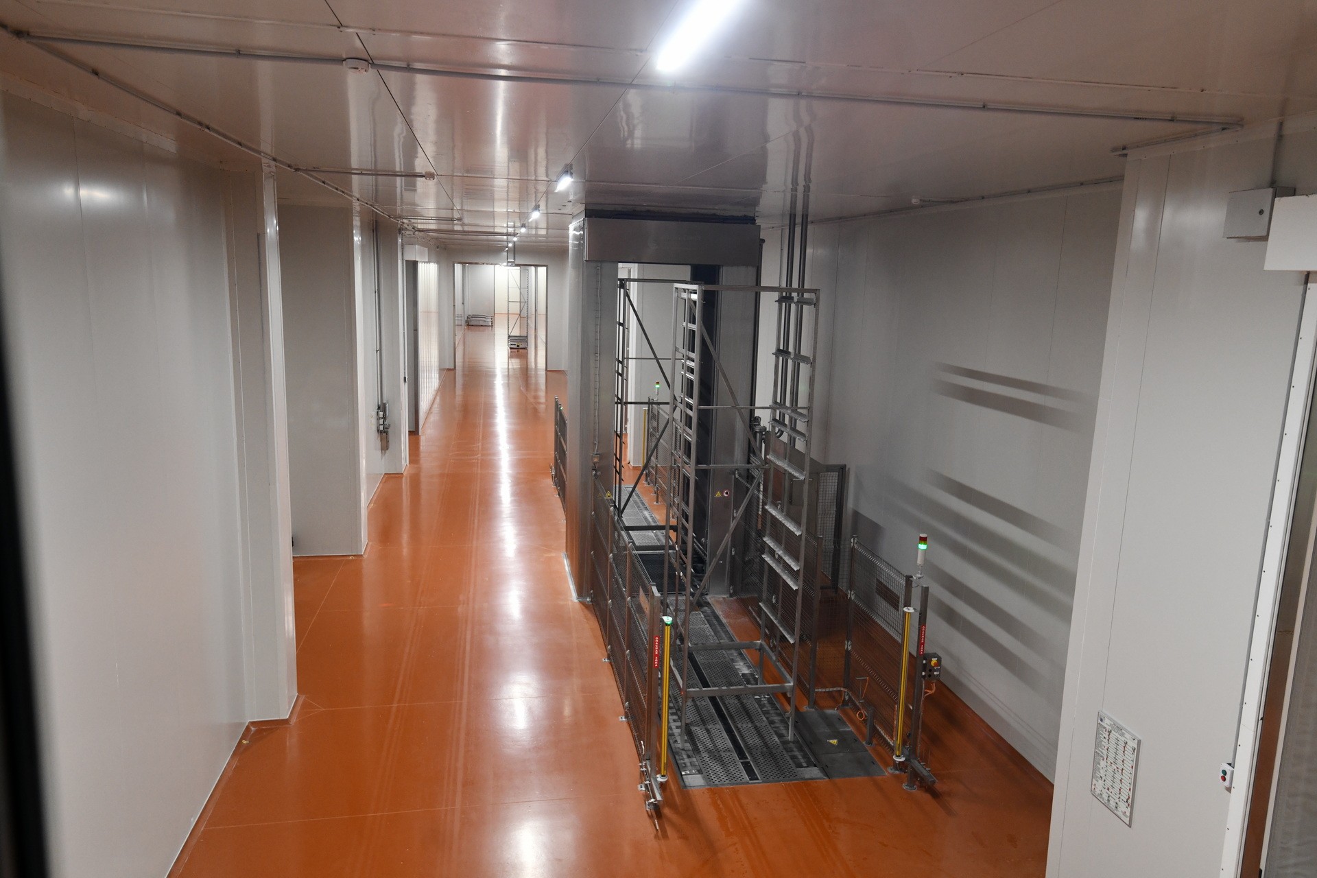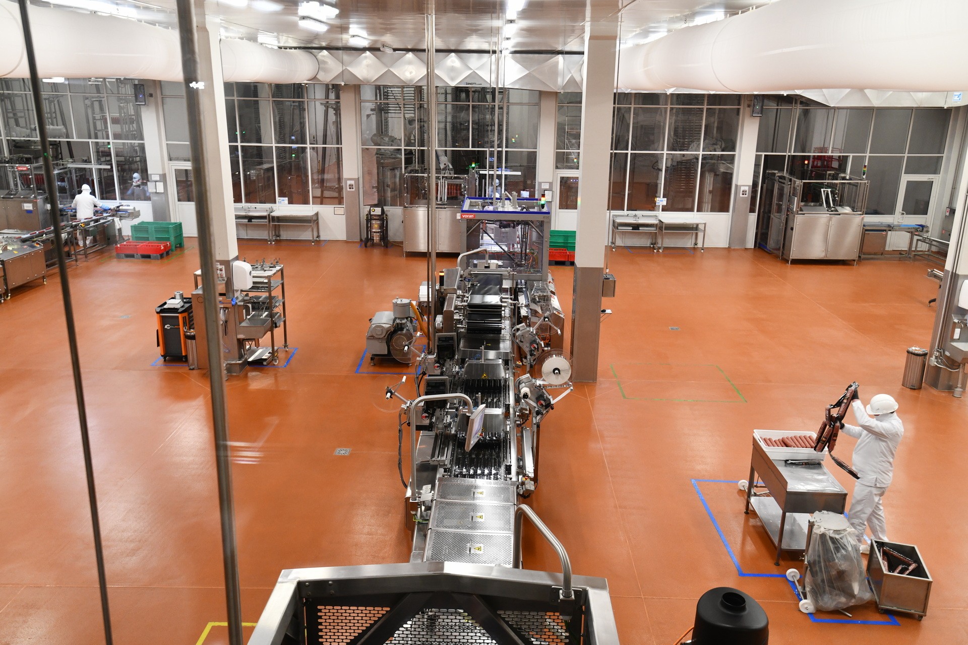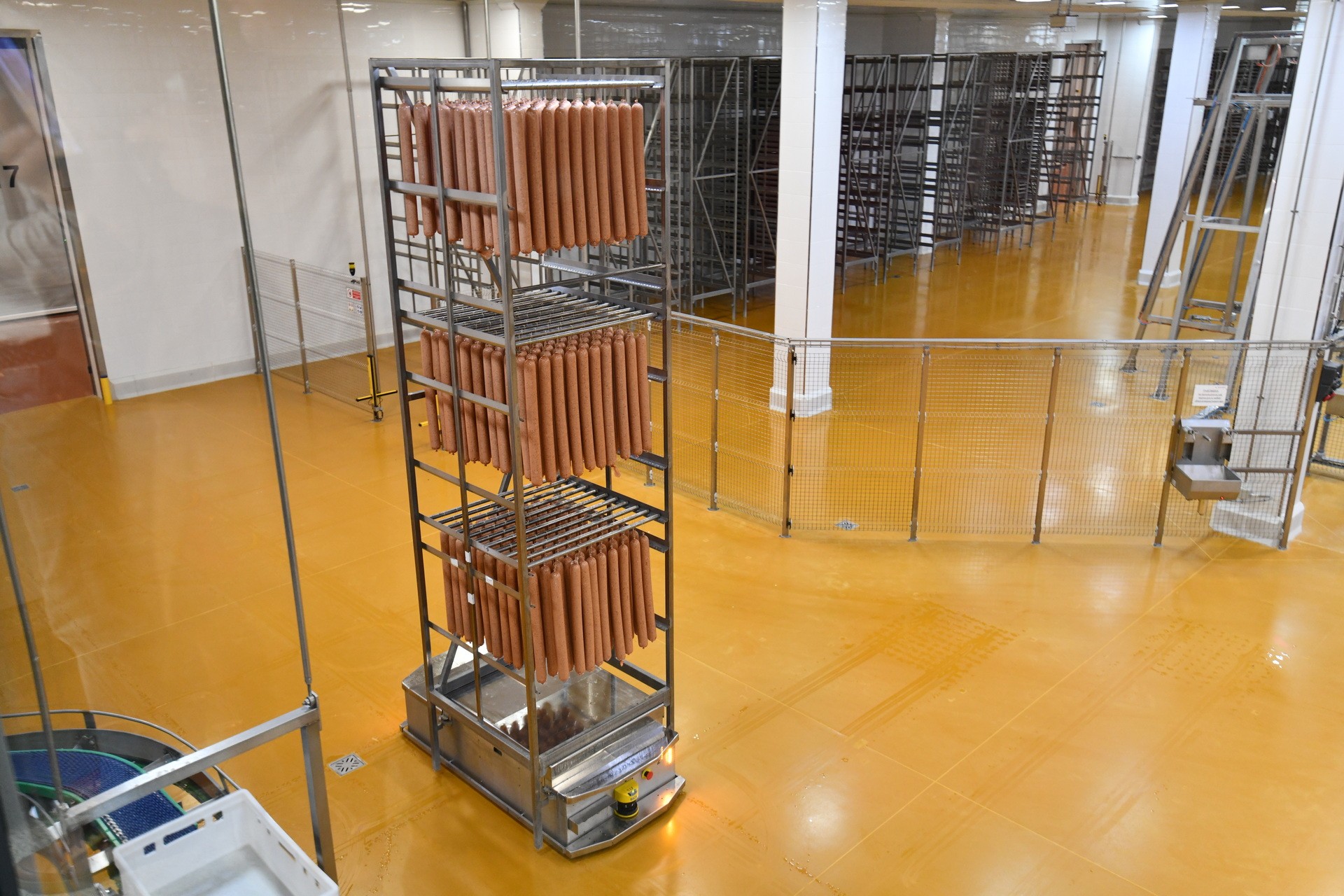 Затем роботизированные шаттлы, которые способны выдержать вес более тонны, развозят рамы с колбасой в камеры ферментации, а их на предприятии тридцать.