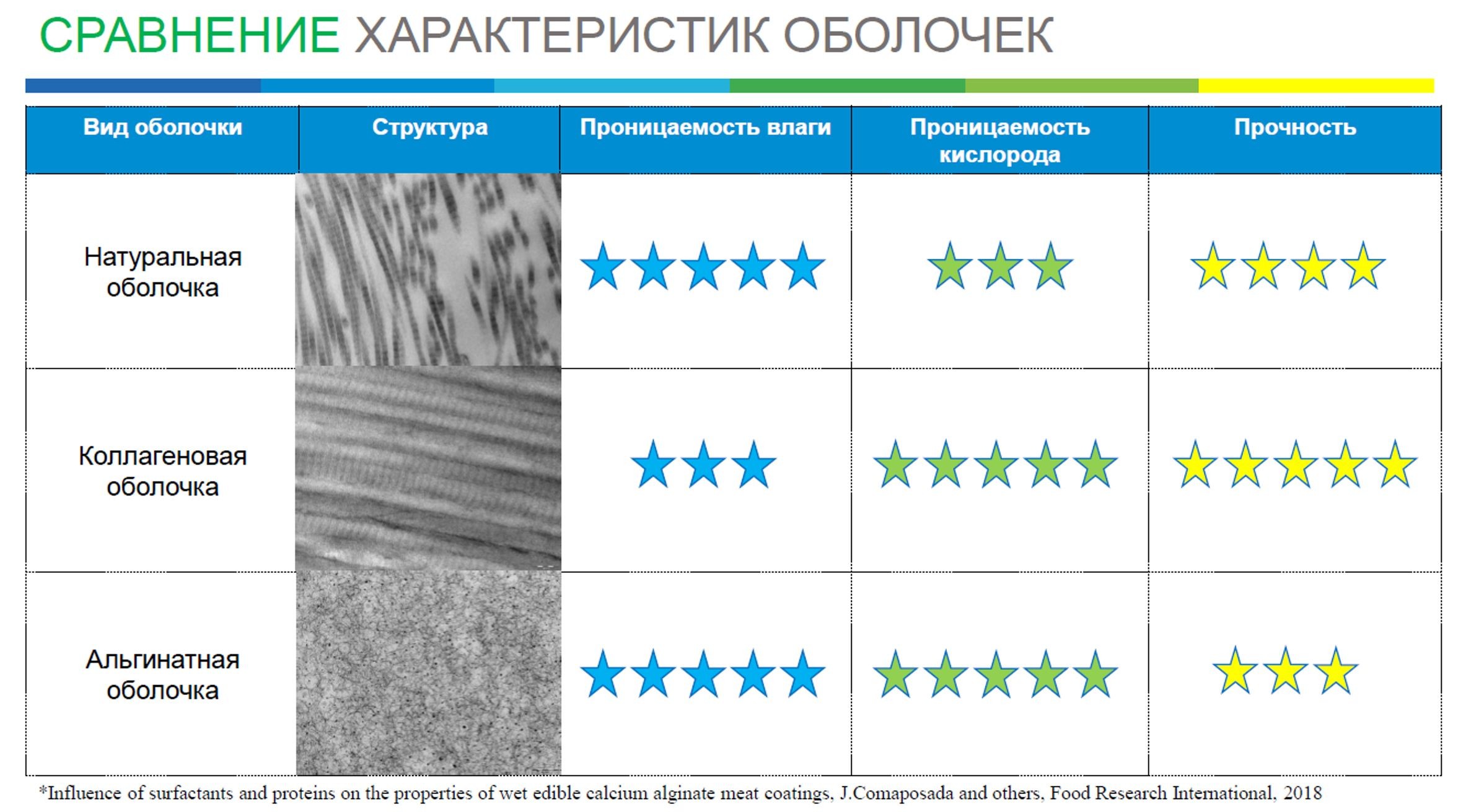 Сравнение характеристик альгинатных оболочек в сравнении с натуральной и коллагеновой оболочками (J.Comaposada and others, Food Research International, 2018)
