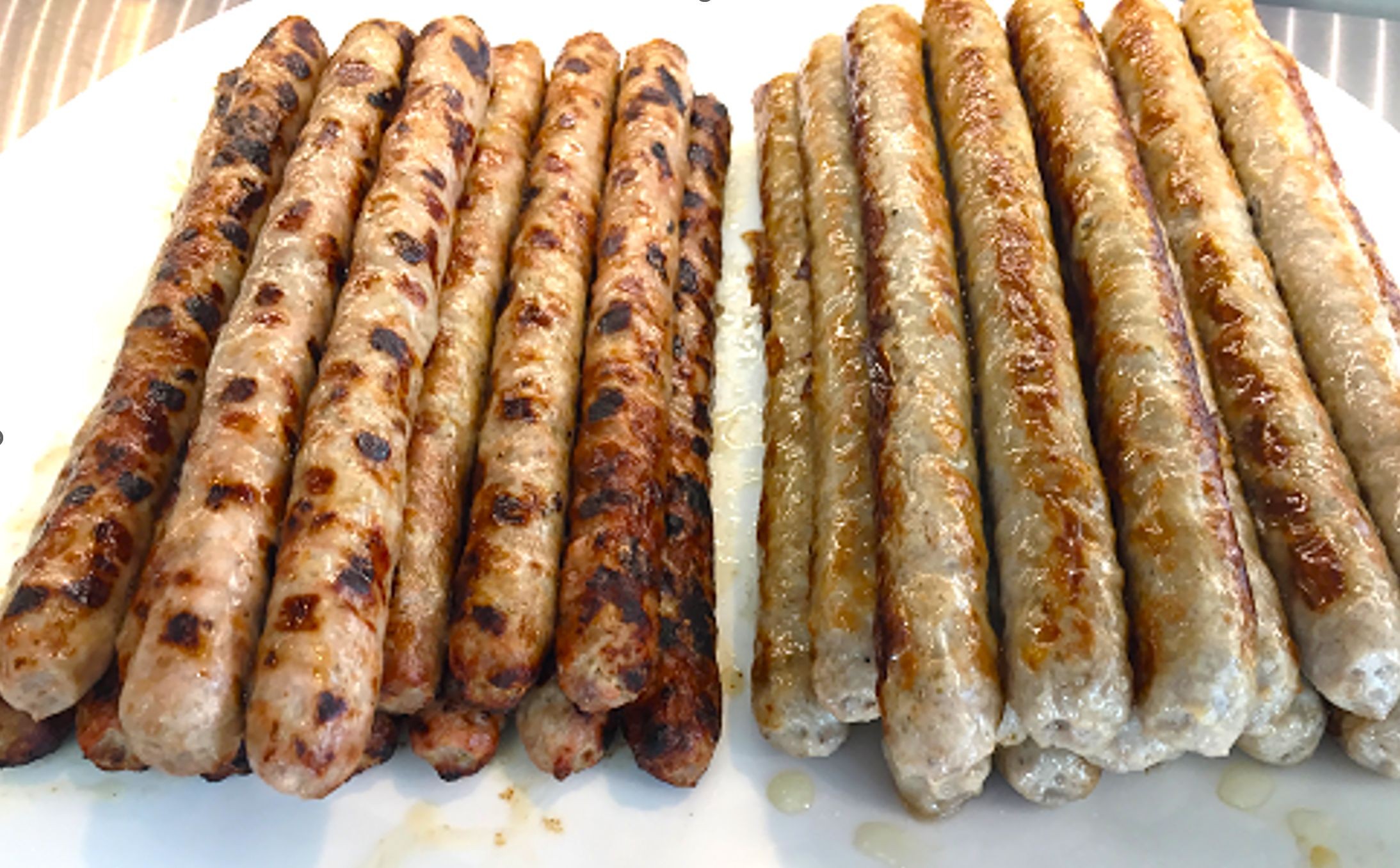 Внешний вид колбасок в альгинатной оболочке после термообработки (слева – на контактном гриле, справа – жарка на сковороде с маслом)