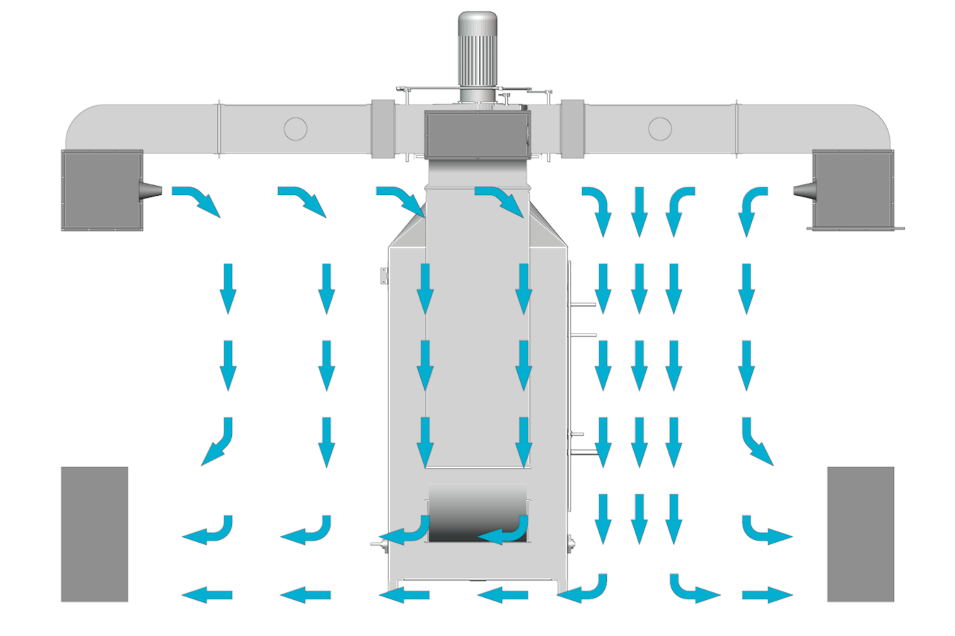 При классической системе циркулирующий воздух подается в камеру вертикально каналами, размещенными вдоль стенок. И забирается каналами, размещенными в центральной части камеры. Количество нагнетаемого воздуха с левой и правой стороны постоянно меняется от минимума к максимуму.