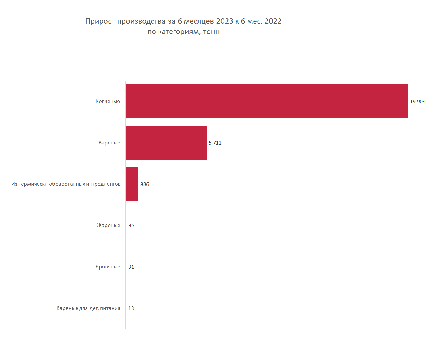 Анализ статистики по производству колбасных изделий в первой половине 2023 года показал рост производства. Наибольший рост в относительных величинах наблюдается по категориям, которые занимают минимальные доли в структуре – жареным и кровяным колбасам, колбасам для детского питания.