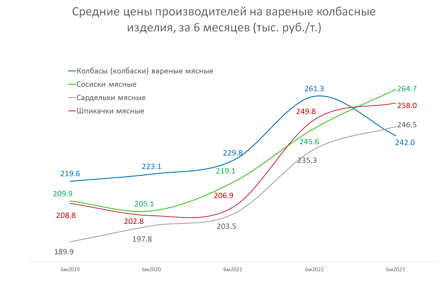 В первом полугодии 2023 года средние цены производства на большинство видов вареных колбасных изделий выросли по отношению к тому же периоду 2022-го. Например, на сосиски, сардельки и шпикачки – на 8%. Исключением стали вареные мясные колбасы, средние цены на которые снизились на 7%.
