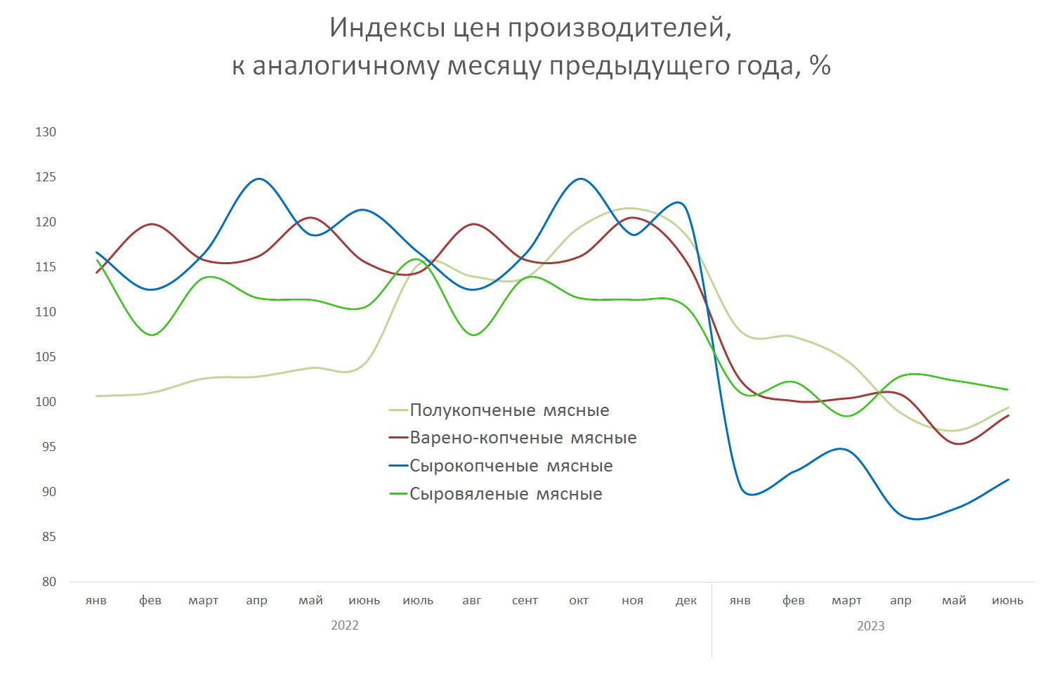 В 2023 году индексы цен производителей в сегменте копченых мясных колбас показали снижение относительно аналогичного периода 2022-го. Самые низкие индексы зафиксированы на сырокопченые колбасы в апреле-мае: примерно на 12% ниже прошлогодних за тот же период.
