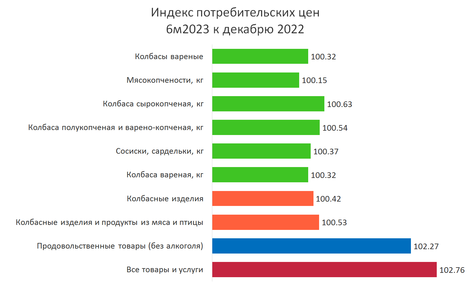 Рост потребительских цен на колбасные изделия в 2023 году ниже уровня инфляции, как в целом на товары и услуги, так и на продовольственные товары.
