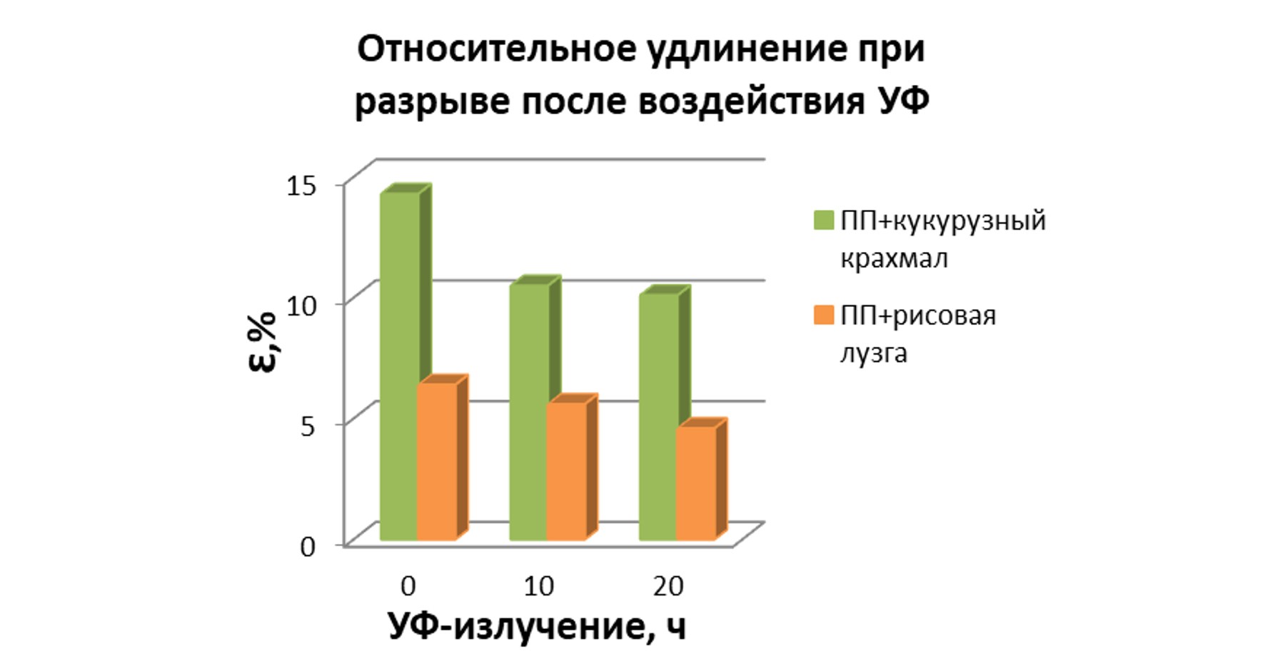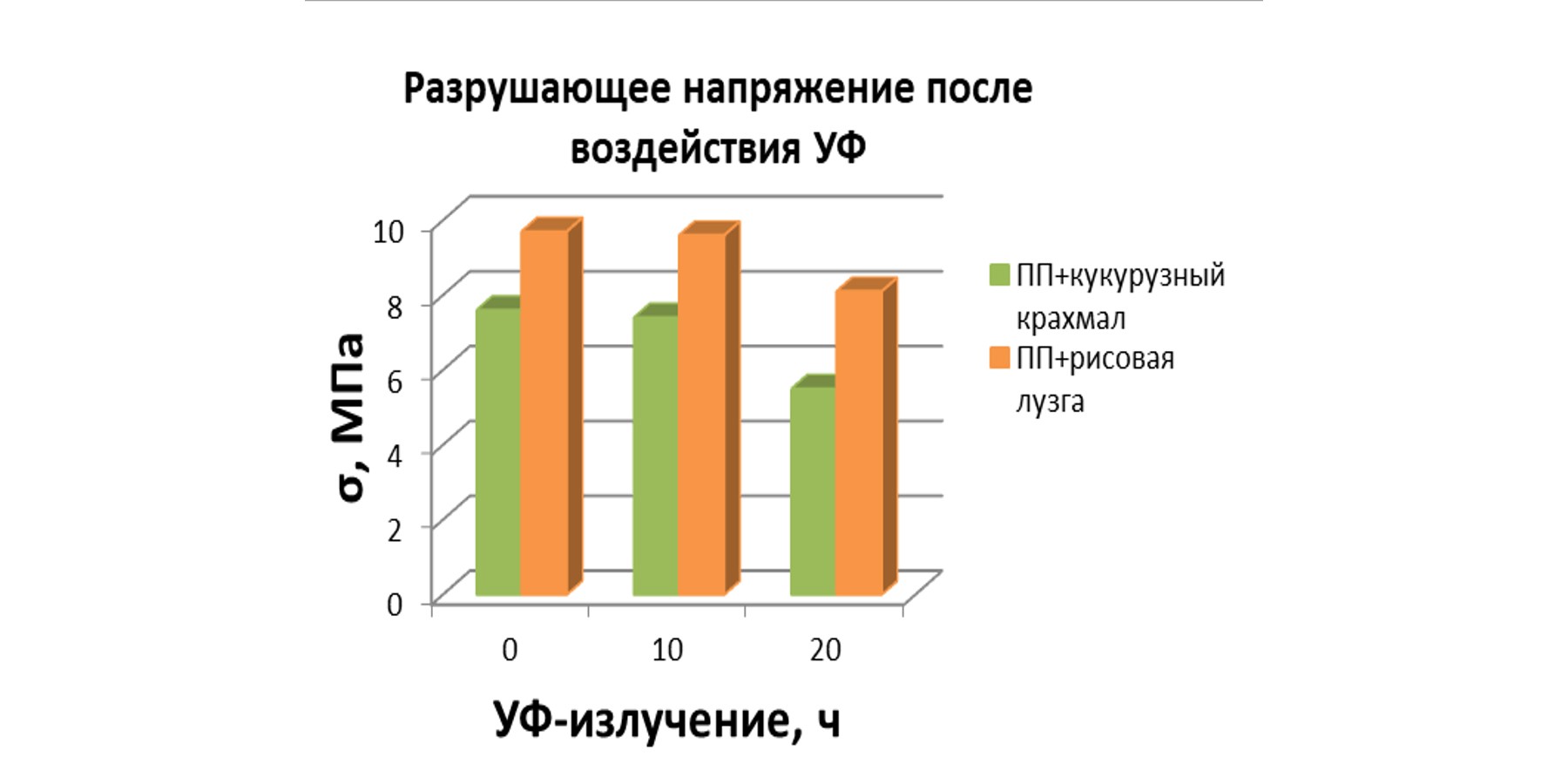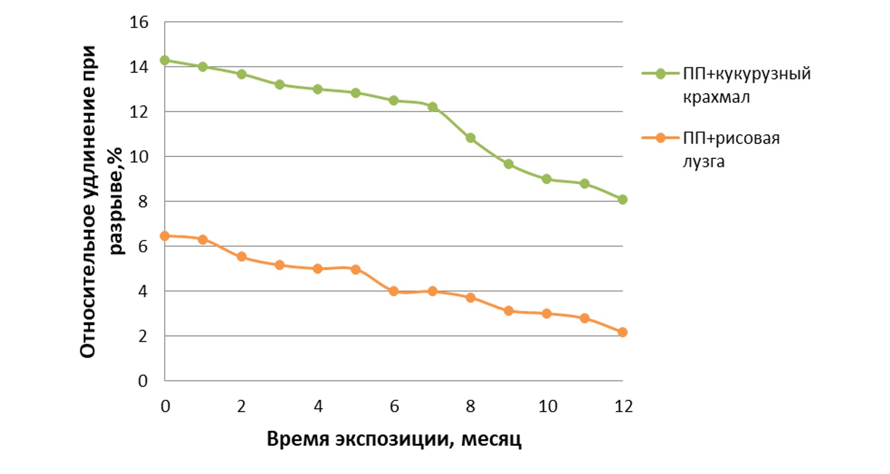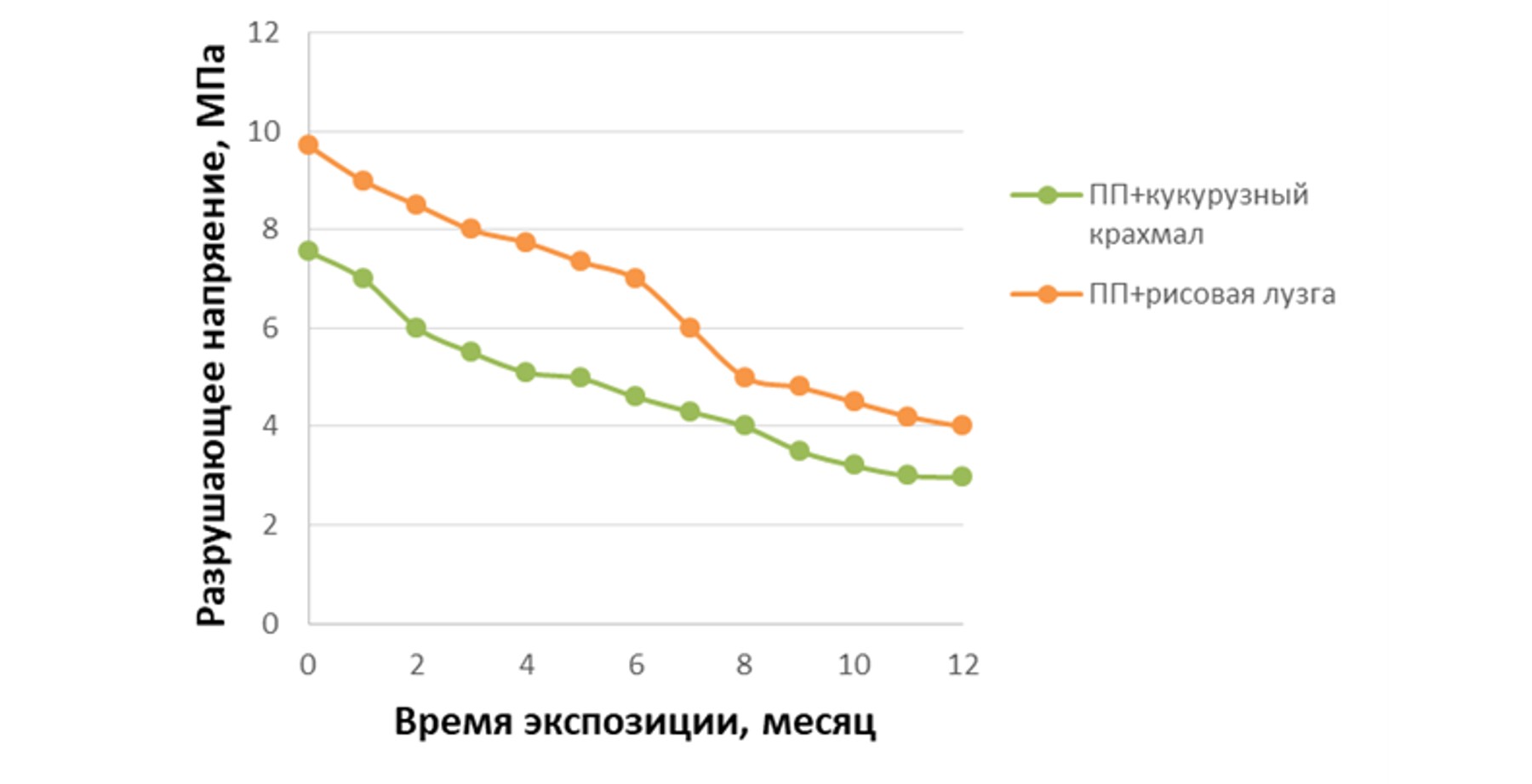 У образцов ПП + кукурузный крахмал и ПП + рисовая лузга каждый месяц наблюдалось снижение физико-механических показателей, что говорит об ухудшении прочности образцов.