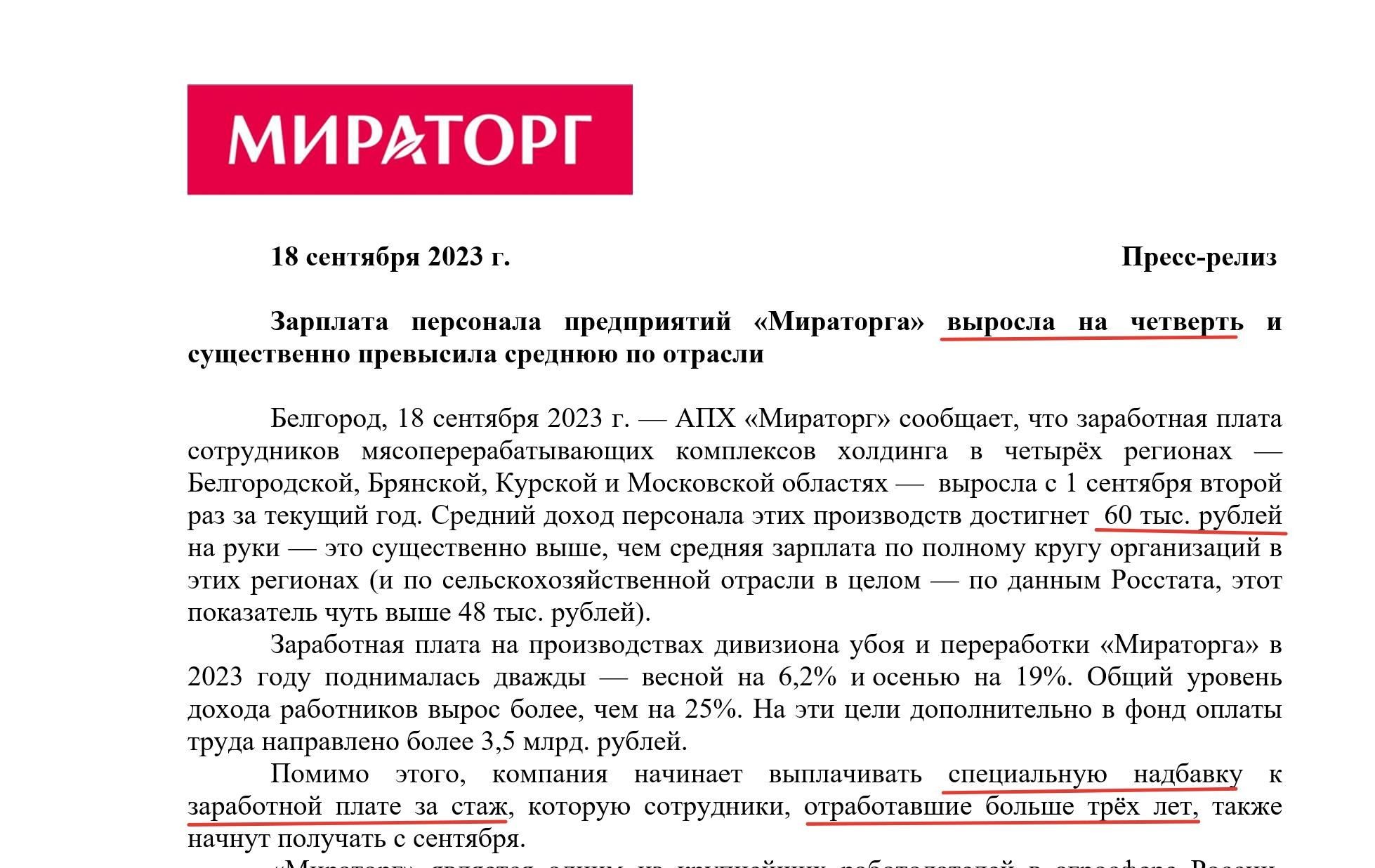 В сентябре 2023 года агрохолдинг «Мираторг» выпустил пресс-релиз о повышении зарплат, где сообщалось, что средняя зарплата на их предприятиях превышает общеотраслевой показатель. Вас ничего не удивляет? Крупная частная компания дает такую информацию, раскрывает средний доход персонала, детализируя, в каком дивизионе на сколько процентов выросла зарплата.
