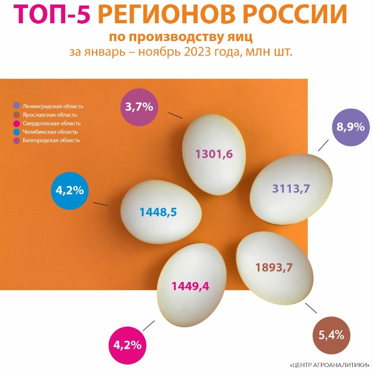 По итогам 11 месяцев 2023 года Ярославская область вышла на первое место в Центральном федеральном округе по производству куриных яиц в сельскохозяйственных организациях с суммарным результатом 1893,7 млн штук. В общей сложности в январе–ноябре прошлого года птицефабрики ЦФО получили 8761,2 млн пищевых куриных яиц. Доля Ярославской области на отечественном рынке составила 5,4%, в округе — 21,6%, годовой прирост — 4%. В масштабах России регион занял вторую позицию, уступив лидерство Ленинградской области (3113,7 млн штук).