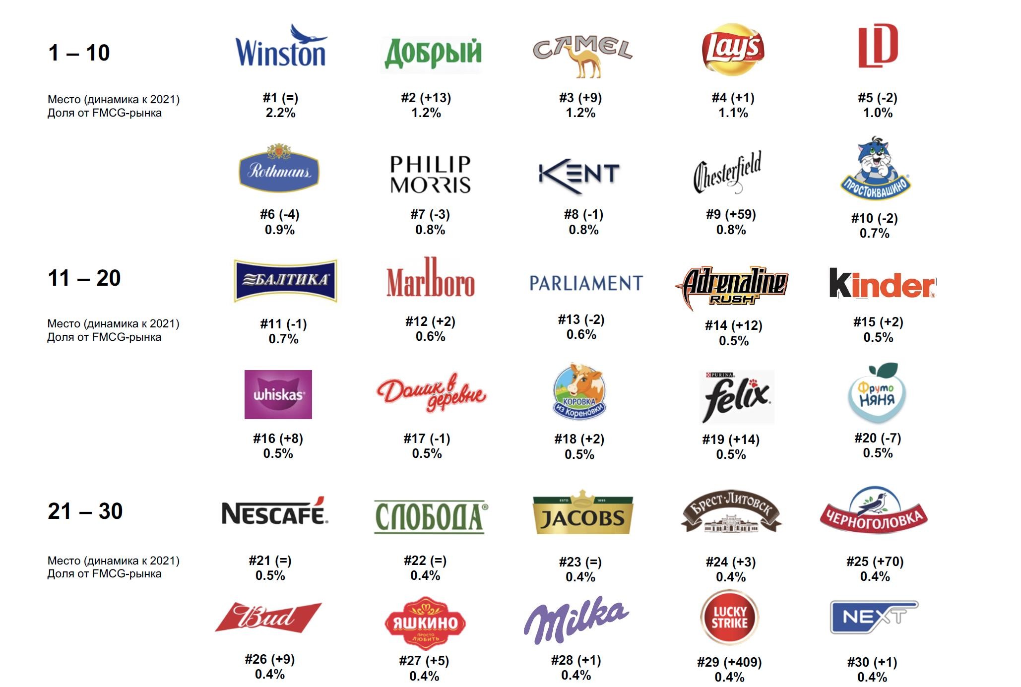 В рейтинг пятидесяти крупнейших FMCG-брендов России в 2023 году, составленный компанией Nielsen в ноябре и призванный проследить изменения «на фоне происходящего брендозамещения», почему-то не вошли ни «Мираторг», ни «Петелинка», ни «Останкино», ни «Аби». Рейтинг оказался вообще без мясников, зато напоминает рекламу табачных брендов.