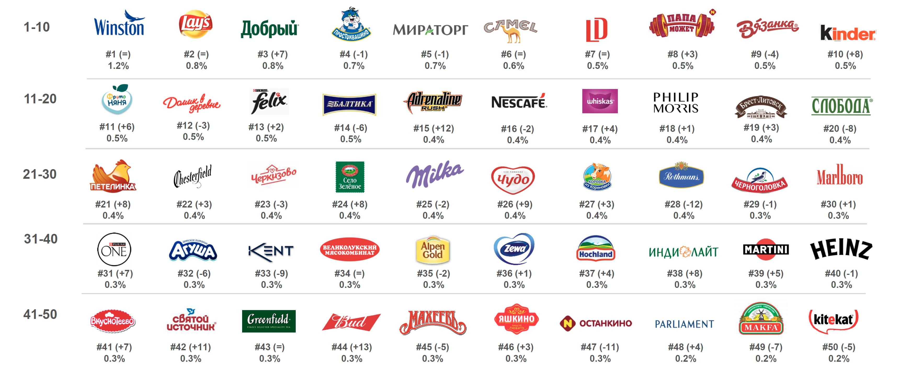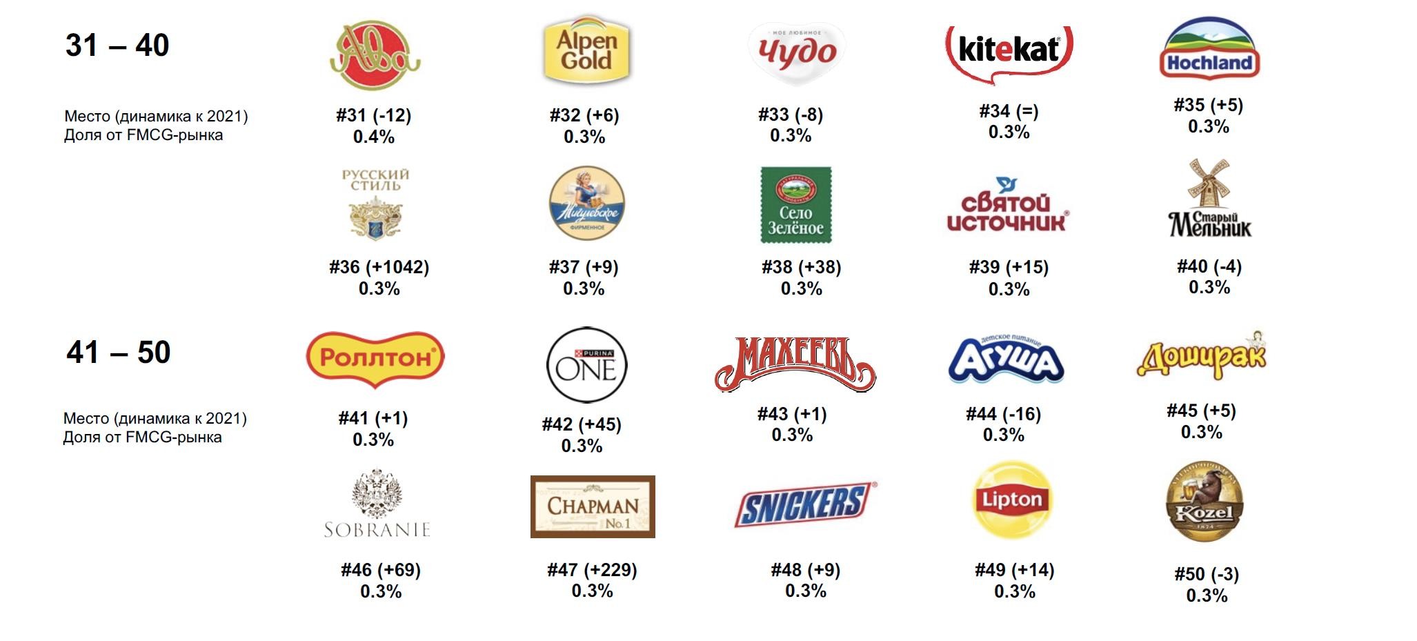 Рейтинг 50 крупнейших брендов по доле денежных продаж от FMCG-рынка в январе–августе 2023, по данным Nielsen