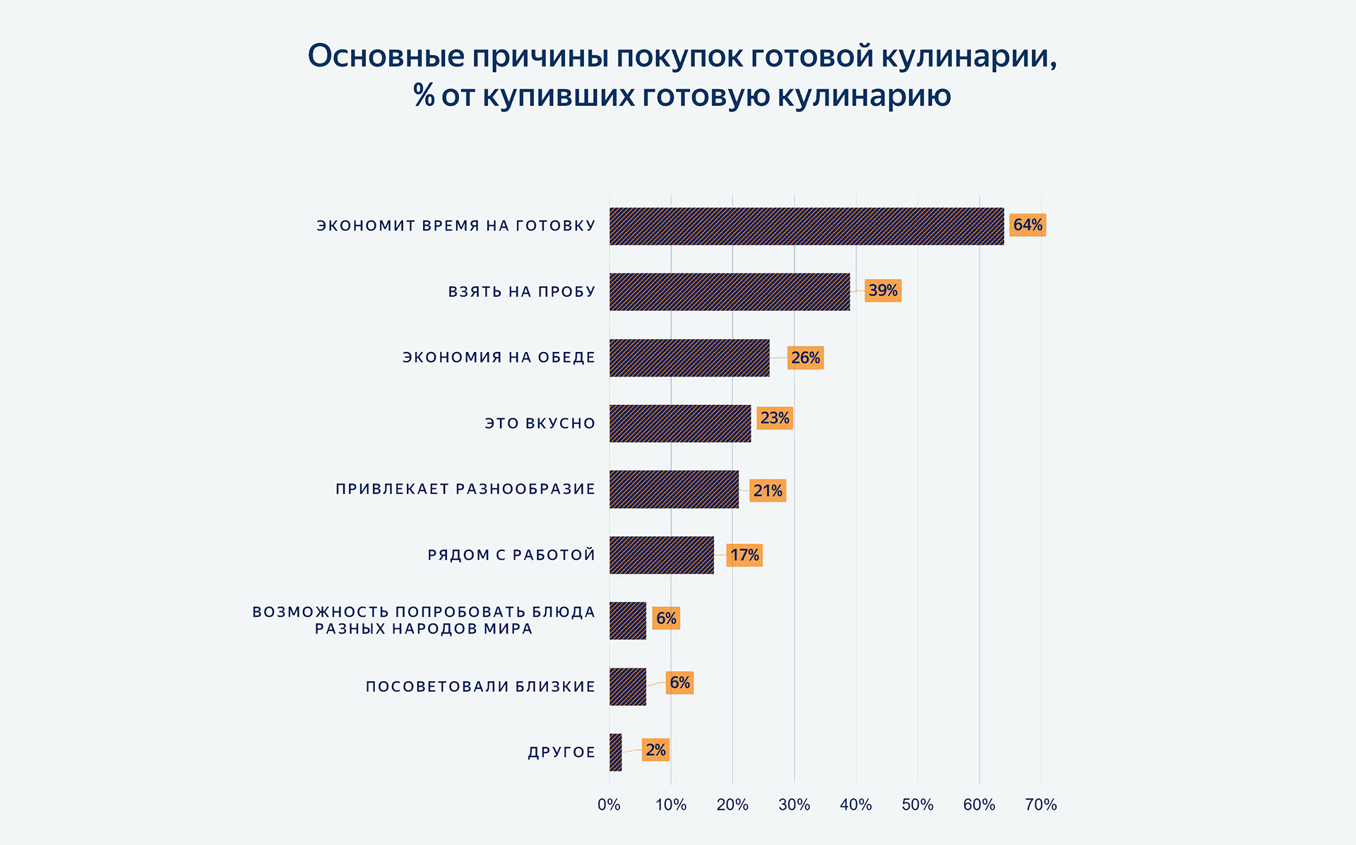 Рост стоимости единицы времени в жизни современного человека также играет важную роль: многие стремятся оптимизировать свое время, что делает готовую еду привлекательным вариантом. По аналитическим данным РБК, Х5 Group, потребители хотят минимизировать время, затрачиваемое на приготовление пищи, и предпочитают решения, которые позволяют им быстро и без лишних усилий удовлетворить свои потребности во вкусном, безопасном и разнообразном питании.
