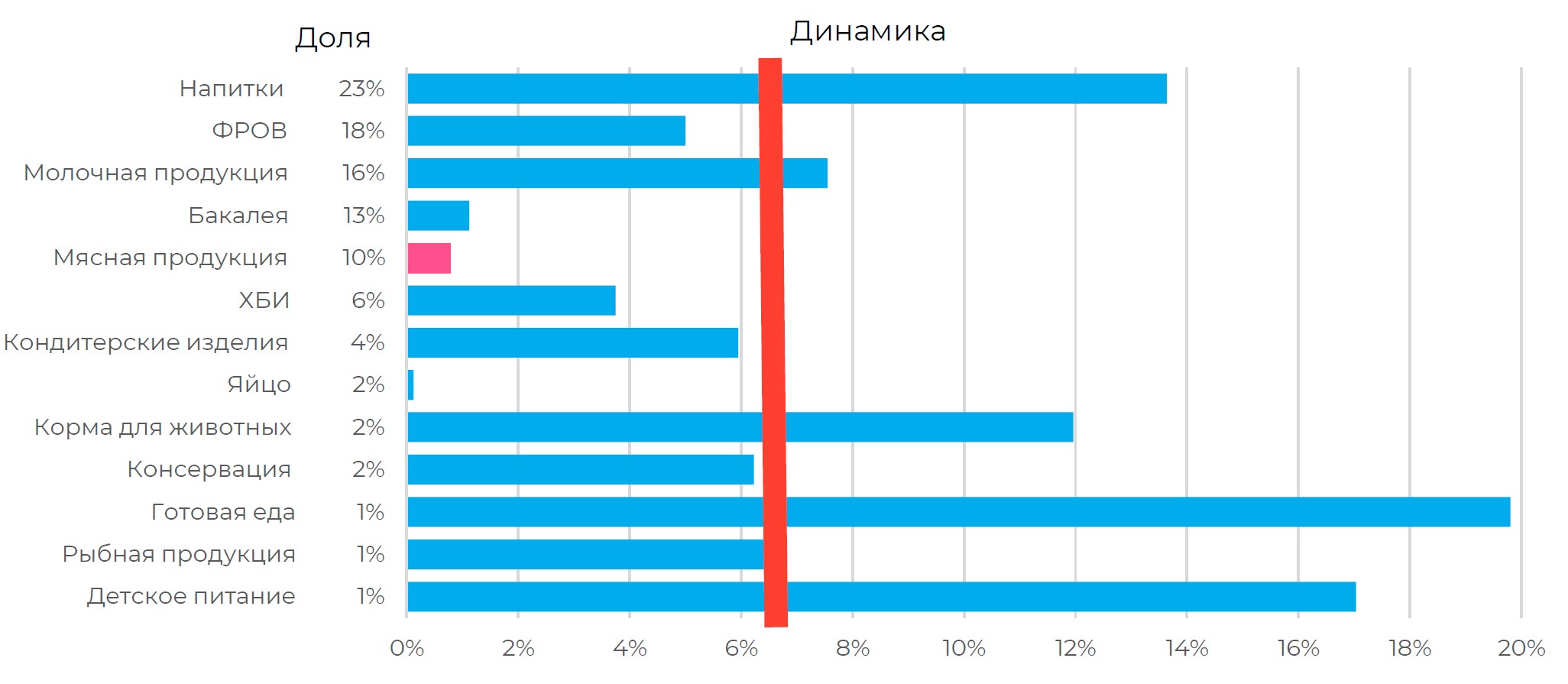 Указана доля групп за 2024 г. от суммарного объема категории «мясная продукция». Динамика: 2024-й к 2023 г. Красная линия – прирост всего рынка продуктов питания за указанный период. Все показатели даны в физическом выражении.