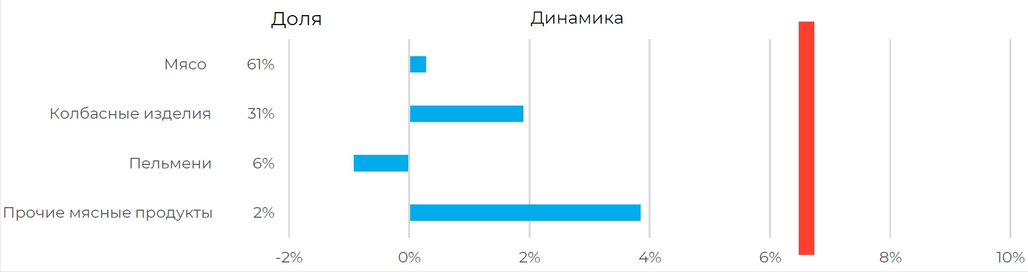 Вместе с тем, динамику категории сложно охарактеризовать как удовлетворительную: на фоне общего роста рынка продуктов питания год к году (на 6,5% в физическом выражении), «мясная продукция» выросла на скромные 0,6%, что формально свидетельствует о стагнации.