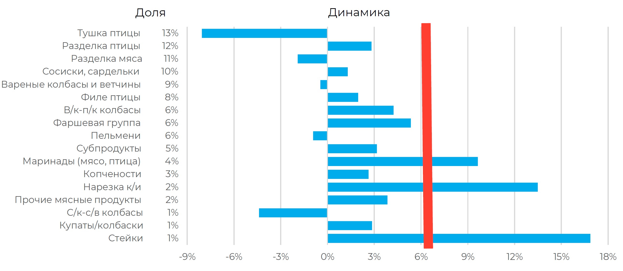 Указана доля подкатегорий за 2024 г. от суммарного объема категории «мясная продукция». Динамика: 2024-й к 2023 г. Красная линия – прирост всего рынка продуктов питания за указанный период. Все показатели даны в физическом выражении.