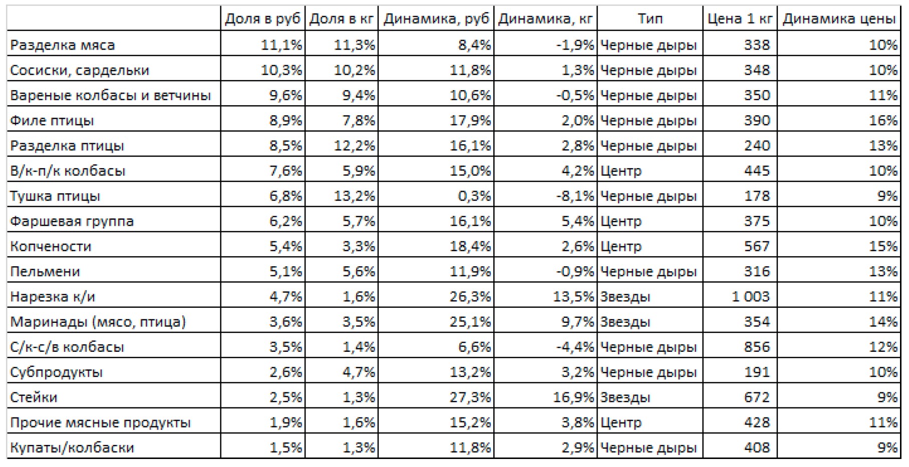 Данные по всем группам, относящимся к подкатегории «мясо»
