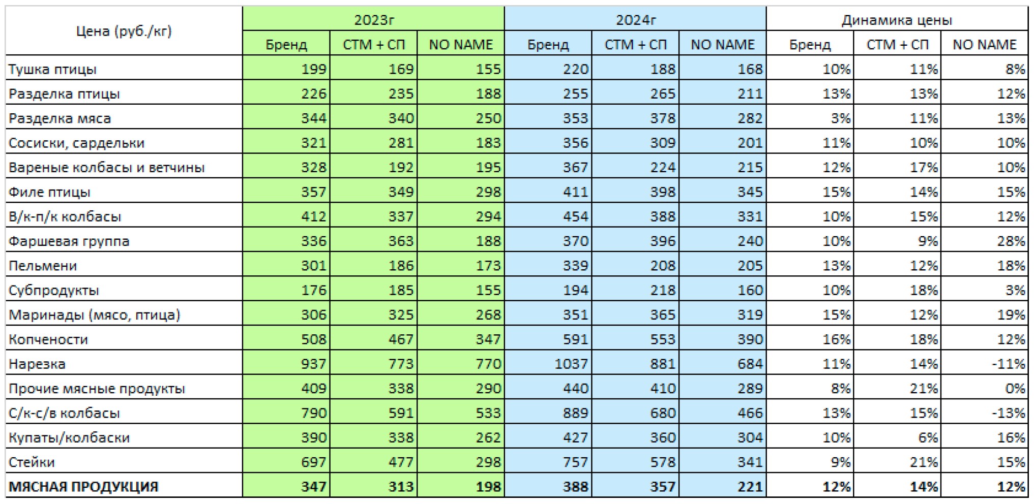 Бренд – бренды производителей, СТМ – собственные торговые марки сетей, СП – продукты собственного производства сетей, NO-NAME – тендерные закупки и продукты, для которых проблематично точно определить бренд. Цена – средневзвешенная за указанный период.