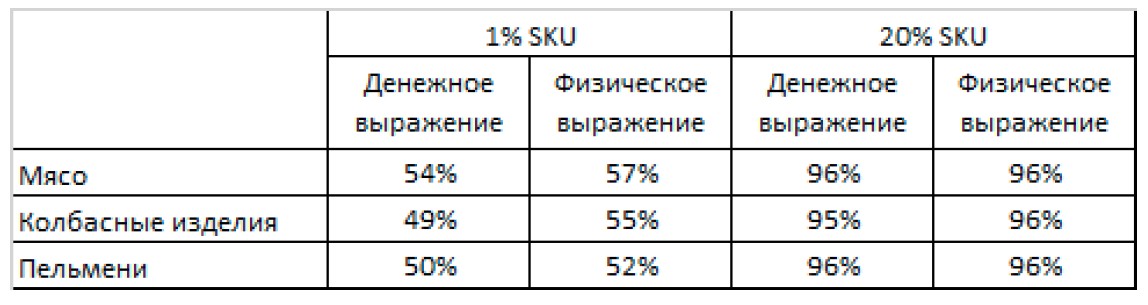 Завершая ассортиментный обзор, необходимо упомянуть, что категория «мясная продукция» (как и большинство других) продолжает оставаться переконсолидированной: на долю всего лишь 1% наиболее популярных SKU приходится около 50% продаж в денежном выражении и около 55% в физическом.