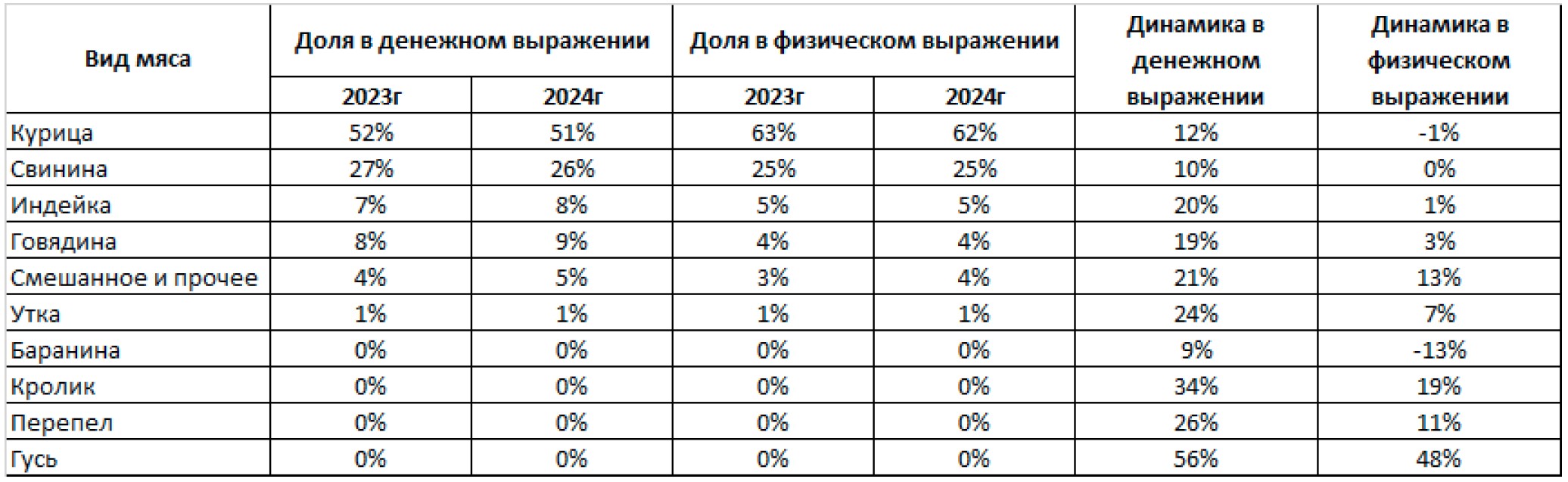 По итогам 2024 года категория «мясная продукция» продолжает оставаться одной из наиболее значимых на продовольственном рынке, занимая в продуктовой корзине россиян 16,3% в денежном и 9,6% в физическом выражении.
