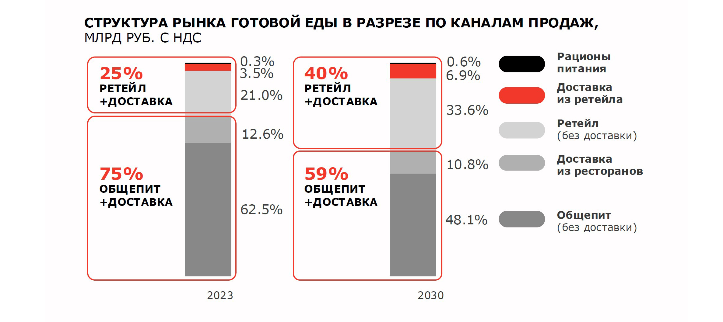 Динамичное развитие рынка готовой еды будет сопровождаться и структурными изменениями в каналах продаж. Розничные сети смогут существенно укрепить свои позиции на рынке за счет роста ассортимента готовой еды, улучшения ее качества и доступности. По итогам 2030 года FMCG-ритейлеры займут 40% рынка готовой еды и продемонстрируют опережающий рост по сравнению с динамикой рынка в целом.