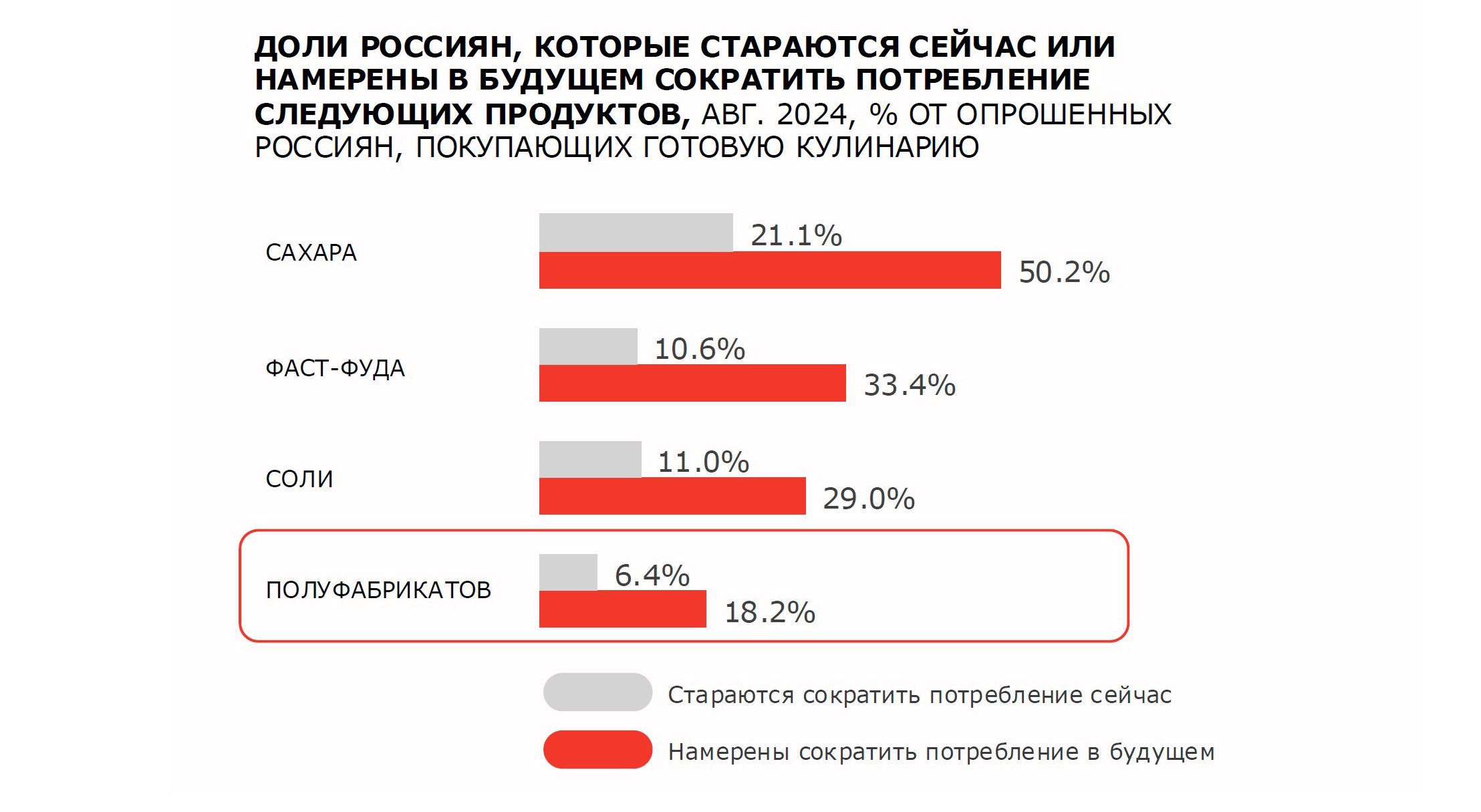 «Магнит» совместно с РБК при опросе потребителей готовой еды, в том числе, зафиксировал пищевые привычки россиян. Так, в 2024 году 46,5% придерживались тех или иных ограничений в еде или диет. Среди самых популярных продуктов для «отказа» оказались сахар, фастфуд, соль и полуфабрикаты. При этом планируют отказаться от этих продуктов в будущем значимо больше потребителей готовой еды (в 2-3 раза больше).