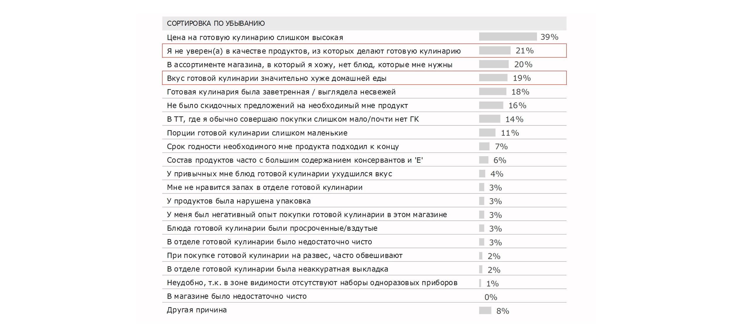 В исследовании потребителей готовой еды приняли участие и те, кто покупает готовую еду редко. В качестве ключевых барьеров (топ-5) для частого потребления готовой еды были выявлены: