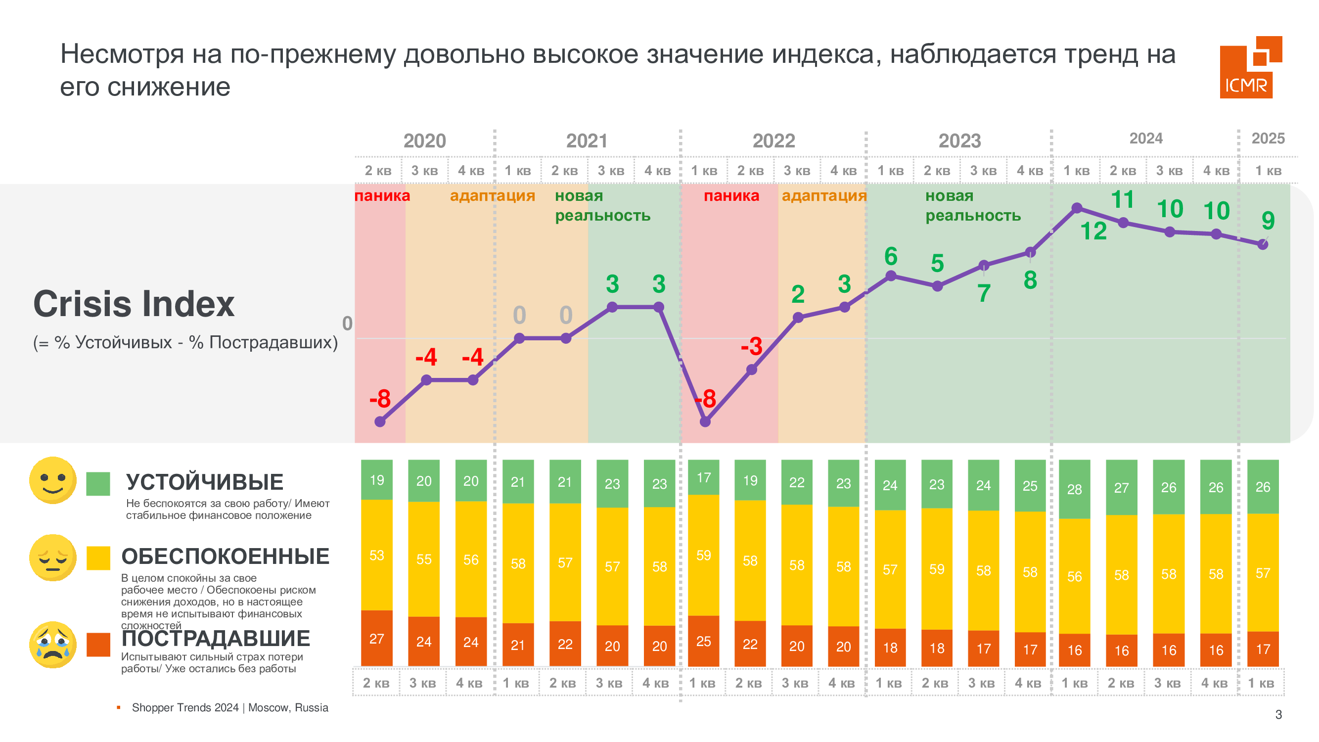 Кризисный индекс показывает, что российский потребитель продолжает находиться в состоянии оптимизма. Но по состоянию на первый квартал 2025 года исследования ICMR фиксируют все же снижение этого оптимизма в домохозяйствах в сравнении как с четвертым кварталом 2024 года, так и с первым кварталом 2024-го.