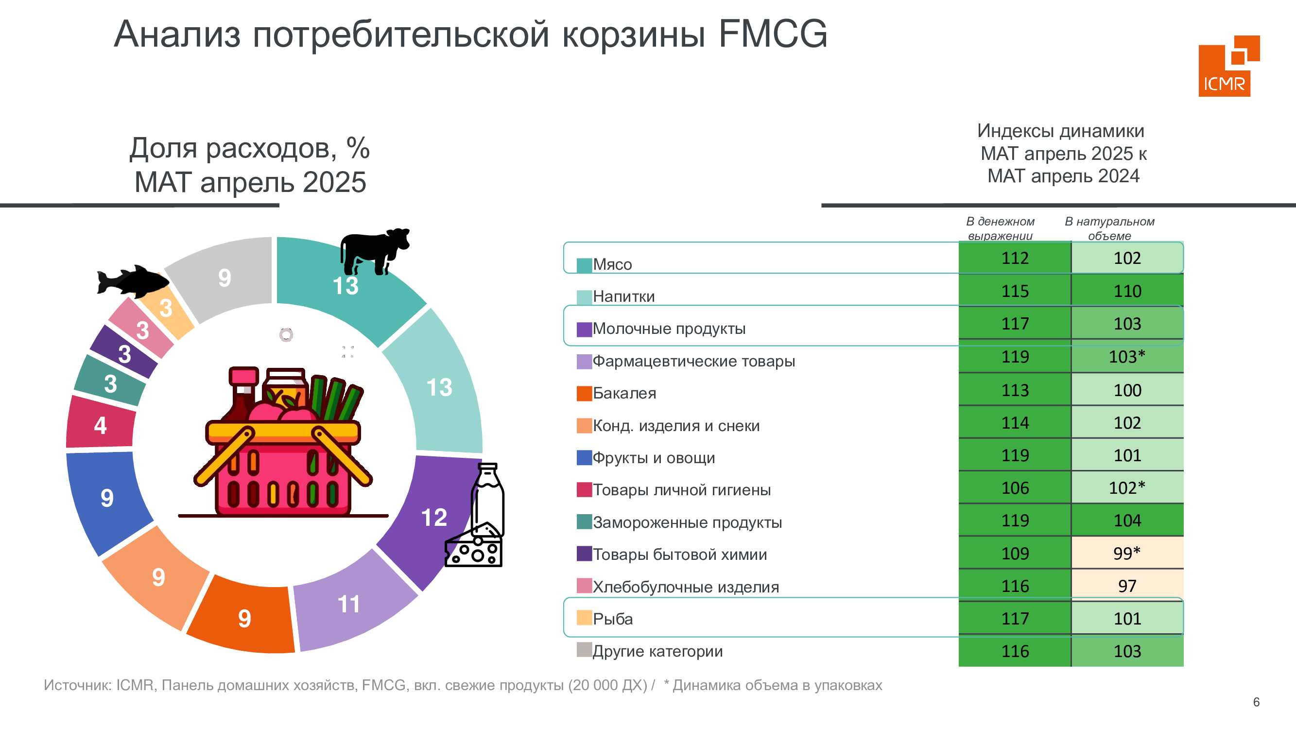 Тем не менее, это не снижает товарооборот в сегменте FMCG. На рынке FMCG наблюдается значительный рост в денежном выражении на 15% в сравнении с прошлым годом (по состоянию на годовых данных к апрелю 2025 года). Рост обеспечивает увеличение частоты покупок на 7,4%. Это говорит о том, что, несмотря на внешние обстоятельства, покупатели чаще посещают магазины, совершают больше решений о покупке и стремятся сохранить привычный уровень потребления.