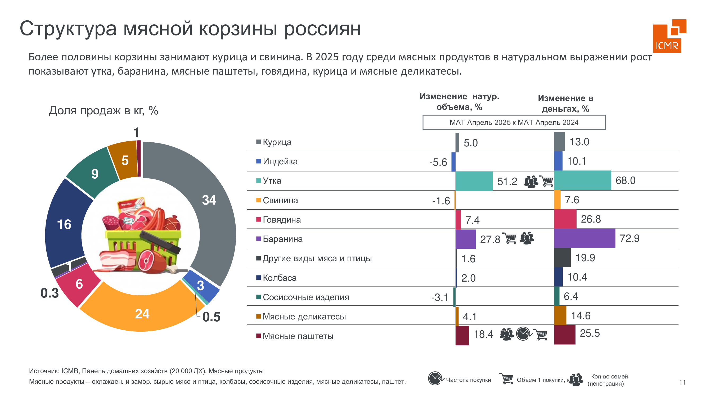 Лидеры и ниши: от курицы до утки. Курица и свинина – доминирующие категории в мясной корзине, которые занимают практически 60%. Куриное мясо остается самым доступным по цене за килограмм. Кроме того, фиксируется обратный тренд переключения: в отличие от тренда прошлого года, покупатели заметно переключаются от рыбы и морепродуктов в пользу бюджетной курицы и мясной гастрономии.
