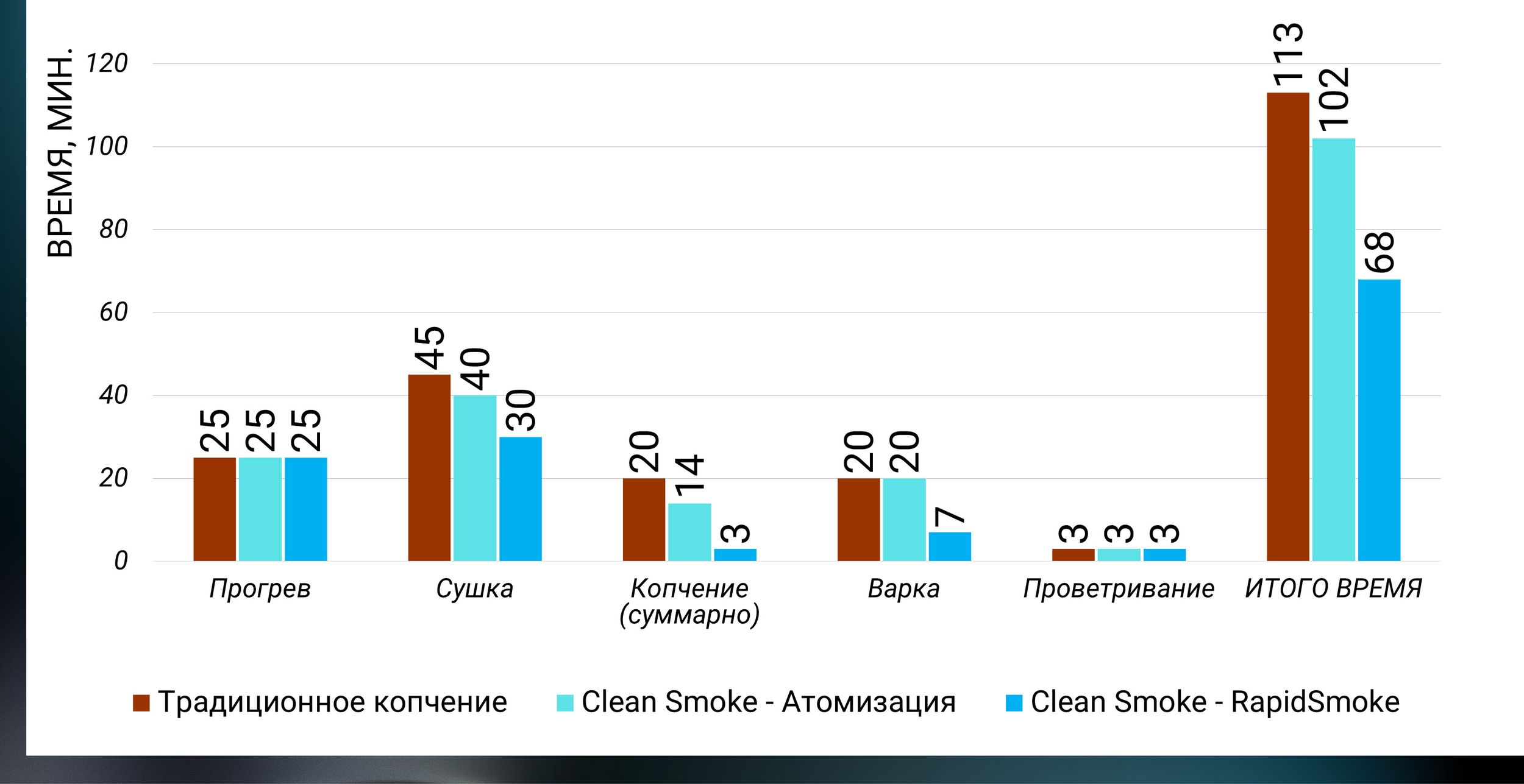 Технология RapidSmoke демонстрирует невероятные показатели эффективности и оптимизации при термообработке за счет уникального подхода к процессу копчения – управлению сразу тремя составляющими в разных физических формах, такими как пар высокого давления, энергия сжатого воздуха и чистого дыма в виде жидкости.