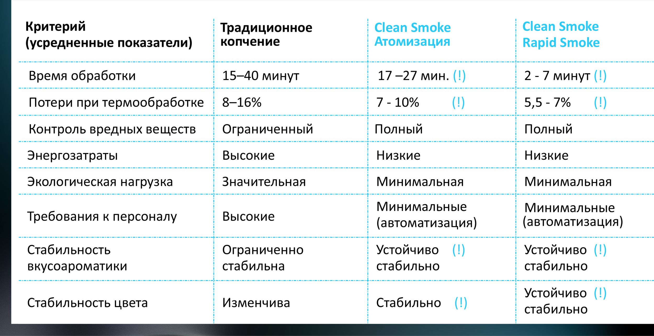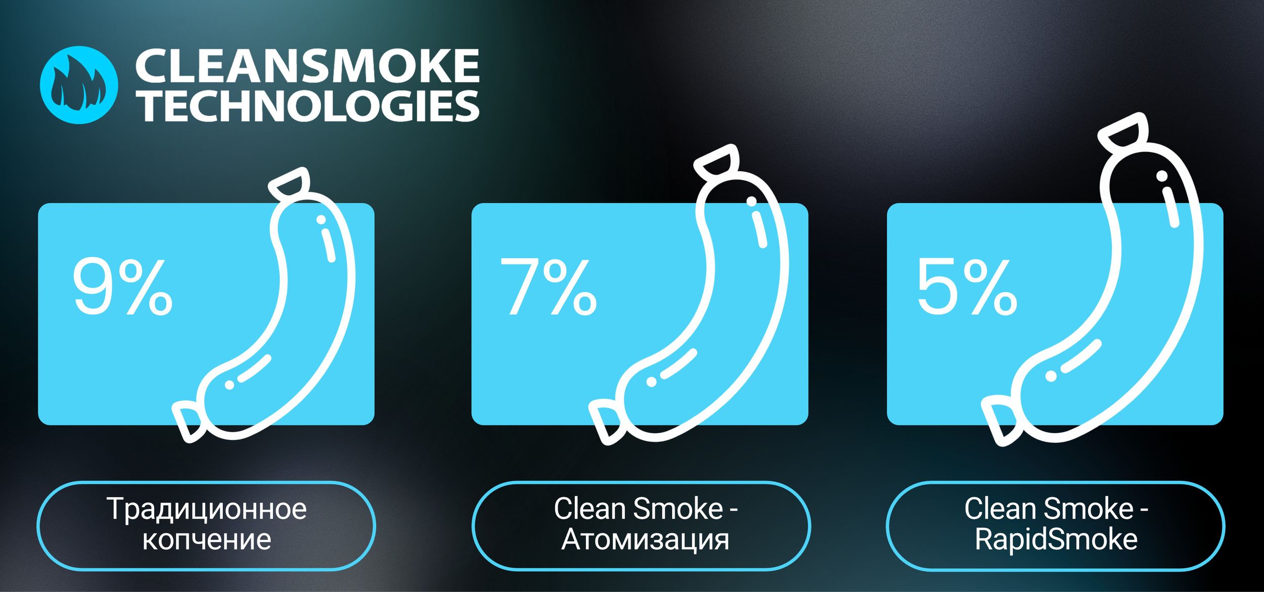 Выводы очевидны: технология Clean Smoke сохраняет массу и качество продукта, минимизирует отходы и затраты, ускоряет производственный цикл, стабилизирует результат и улучшает экологию, что делает ее оптимальным решением для современных пищевых предприятий, ориентированных на эффективность, безопасность и конкурентоспособность.