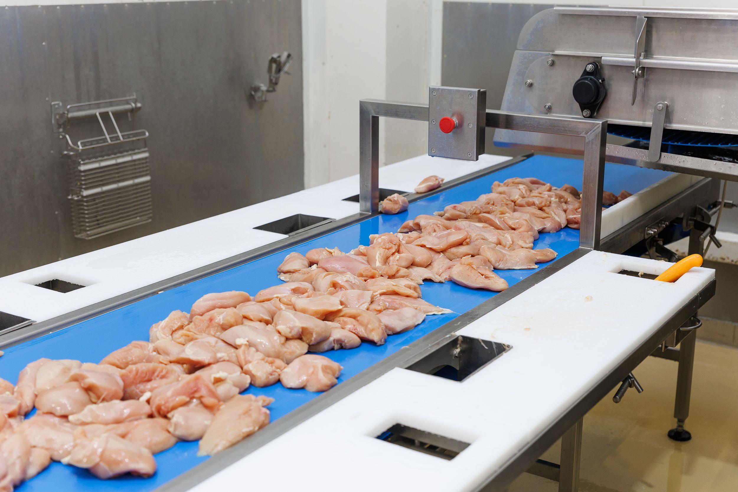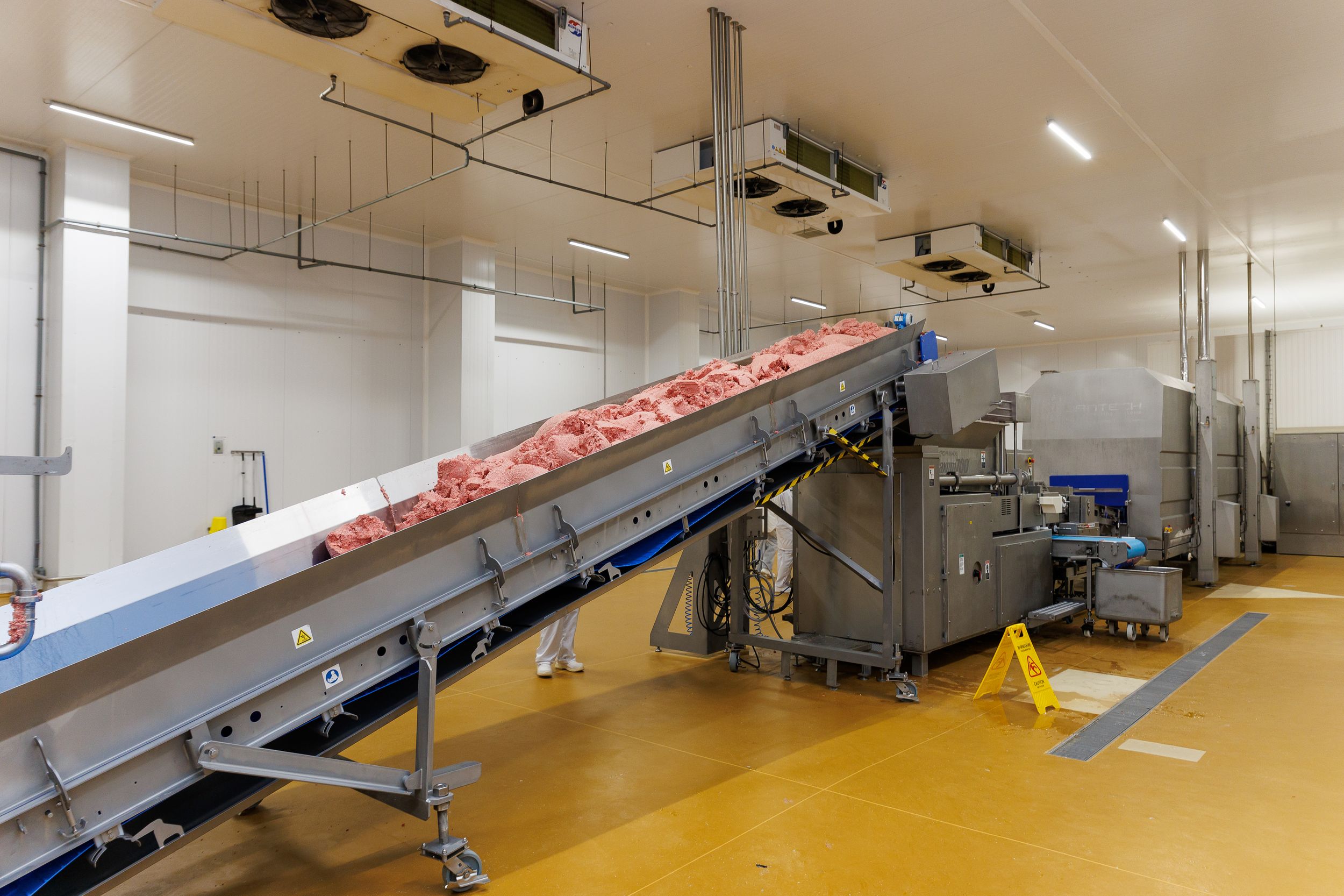 На завод замороженное мясо поступает в блоках весом примерно по 20-25 кг. Поскольку сырье поступает в замороженном виде, оно подвергается дефростации до нужной температуры и далее направляется в производство.