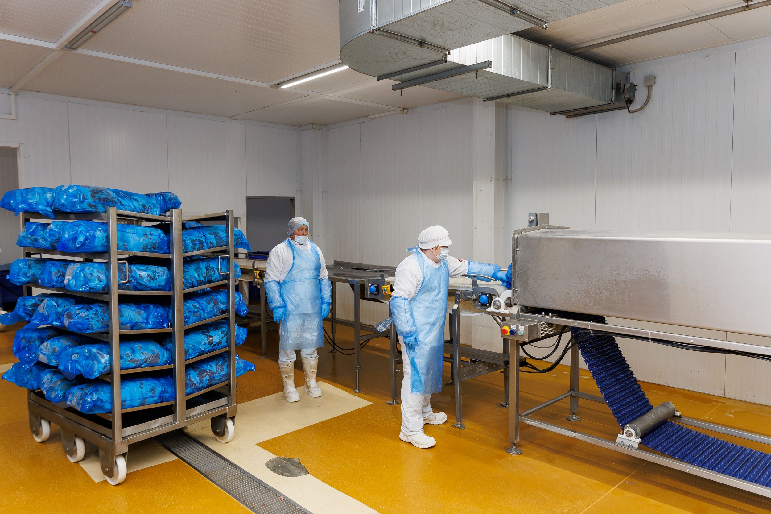 Сформованный продукт сначала подмораживается, далее направляется на заморозку до температуры -18 °С. Потом он укладывается в пакет и помещается в короб, маркируется и направляется на участок формирования паллет. Сформированные паллеты далее поступают на склад.