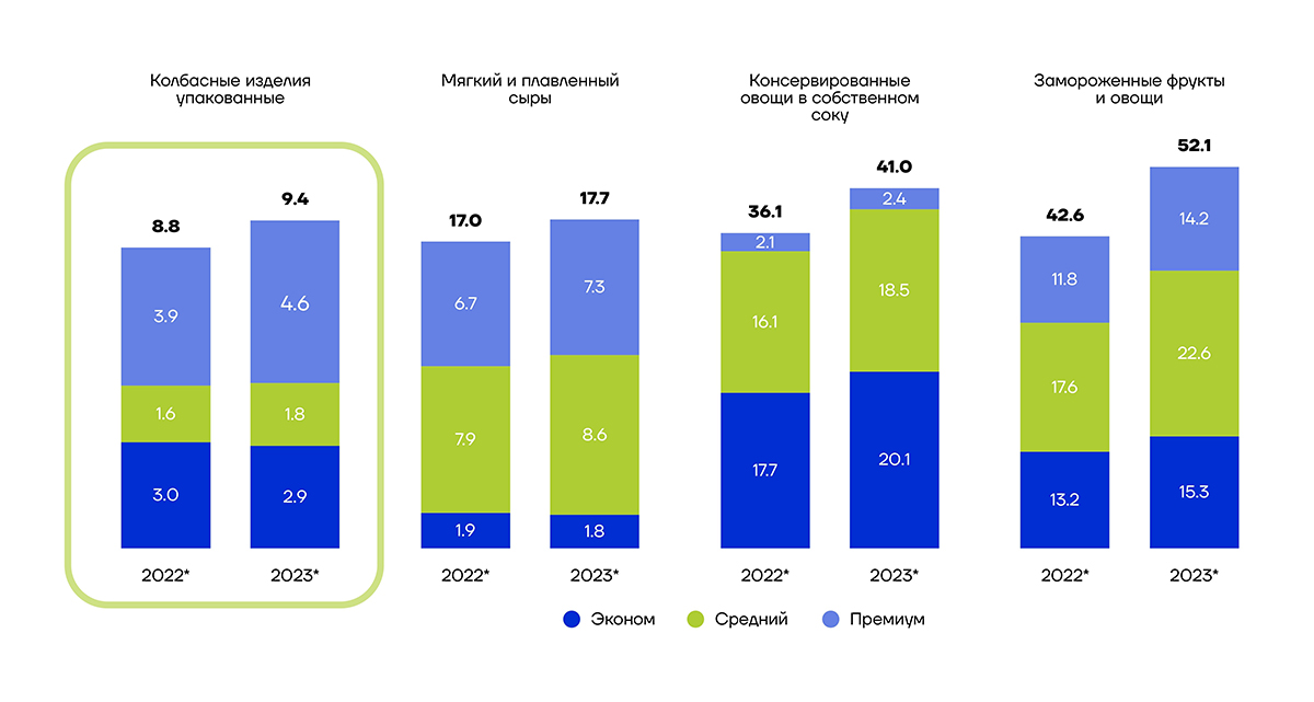 В ответ на эти изменения растет популярность полуфабрикатов, поскольку они позволяют существенно экономить время на приготовлении блюд. При этом категория почти полностью обеспечивается отечественным производством, что гарантирует стабильность и устойчивость к внешним факторам. Также быстрые темпы роста демонстрирует сегмент готовой еды – решения «здесь и сейчас», максимально удобные для современного покупателя.