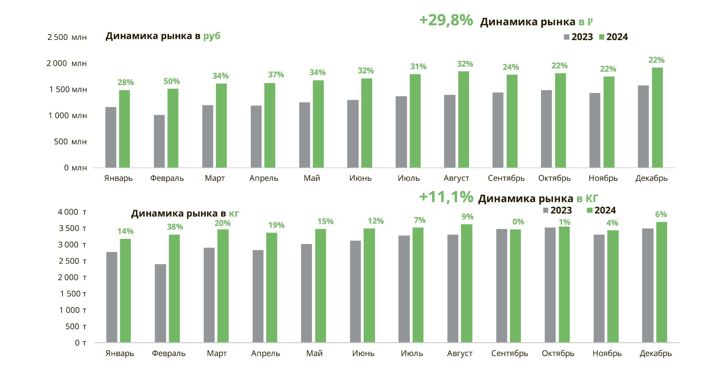 Годовой прирост рынка измеряется двузначными цифрами: 11,1% в натуральном выражении и 29,8% в денежном. Такой разрыв между количественными и денежными показателями объясняется в большей степени ростом цен на сырье.