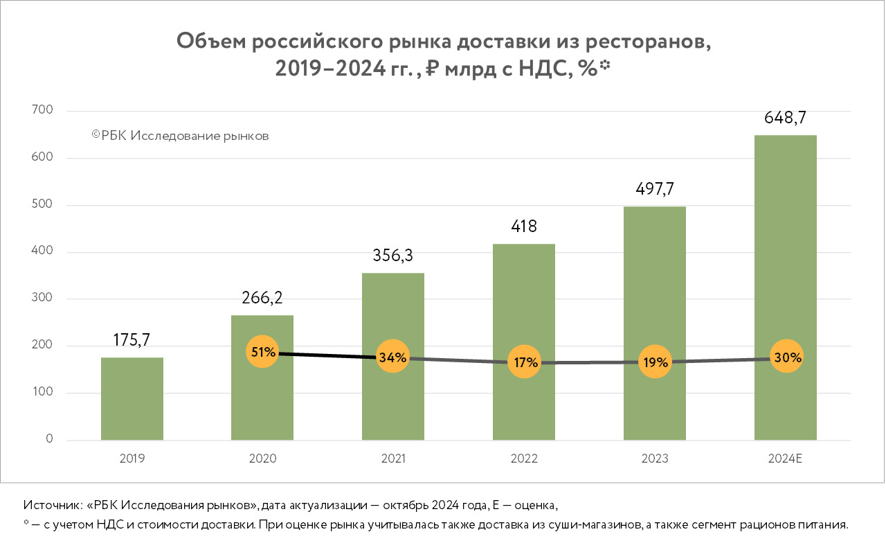 По данным «РБК Исследований рынков», объем рынка доставки готовой еды из ресторанов по итогам 2024 года вырос на 30%.