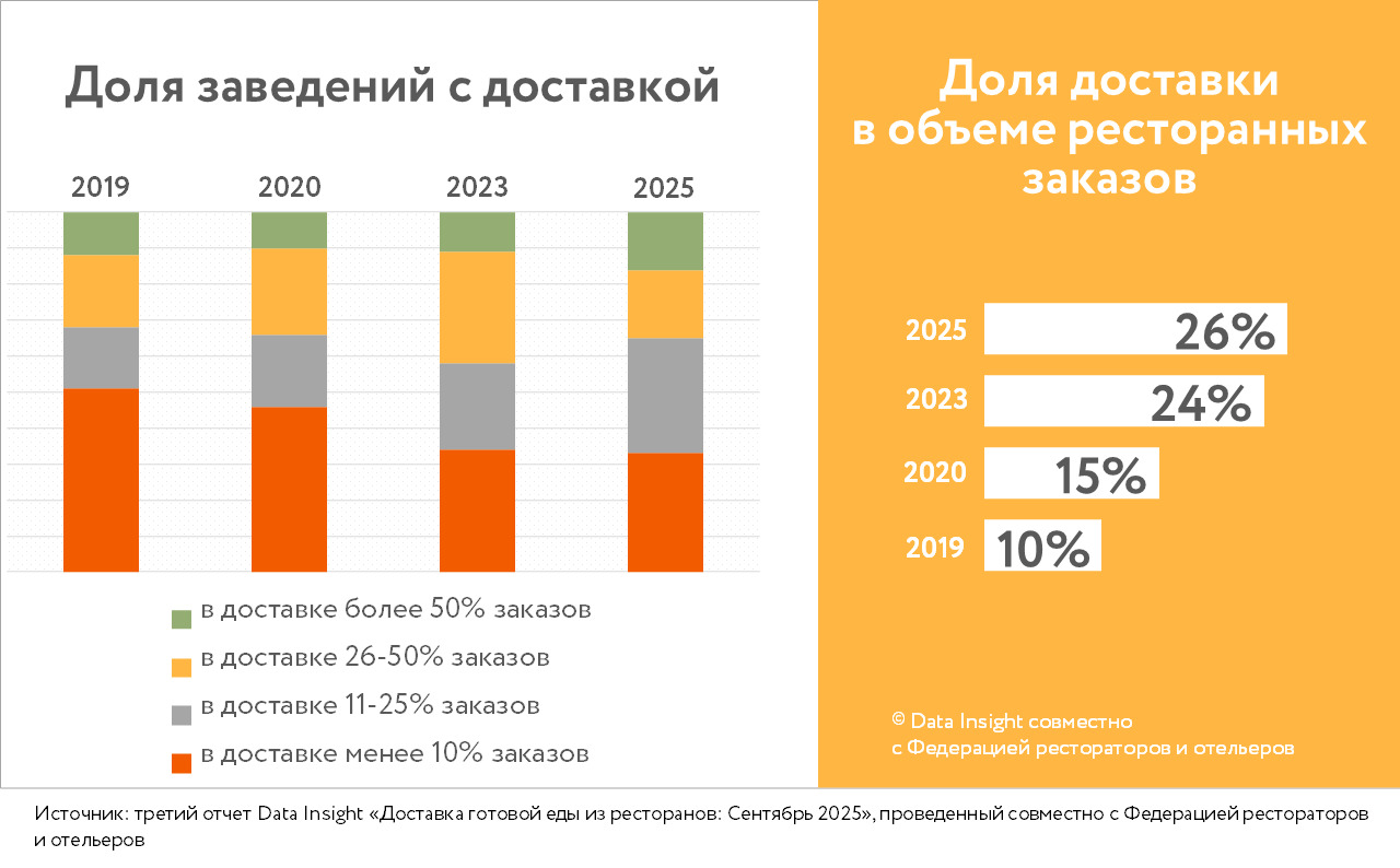 Доля заведений с доставкой стабильно растет, приближаясь к двум третям от общего числа. Этот канал обеспечивает ресторанам более четверти всех заказов, а в отдельных регионах – почти треть. В 2025 году в среднем ежедневно 26% заказов в заведениях общественного питания приходится на доставку. Растет доля заведений с умеренным количеством заказов на доставку (11-25%) и высоким (50%+).