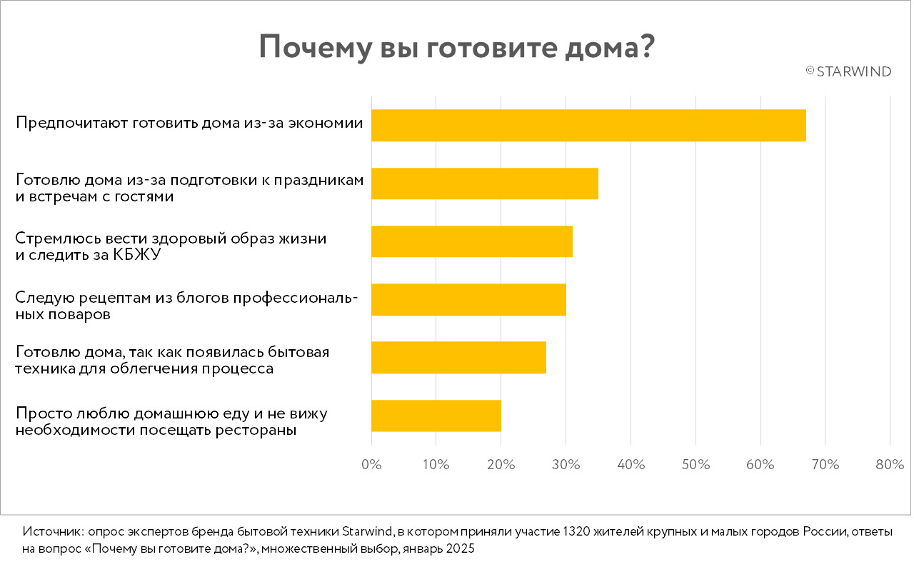 На фоне роста доставки готовых блюд, параллельно потребитель с новой силой открывает для себя домашнюю кулинарию. Нарратив, что россияне не только не отказываются от домашнего приготовления еды, но и начинают больше готовить сами, присутствует последние пару лет. Но только ли экономия стала причиной такой тенденции? Чтобы предлагать решения для продуктов производителям в ритейл, мы разобрались в теме более детально и обратились к экспертам бренда STARWIND – производителю современной бытовой техники, которые провели в этом году опрос на тему домашней кулинарии.