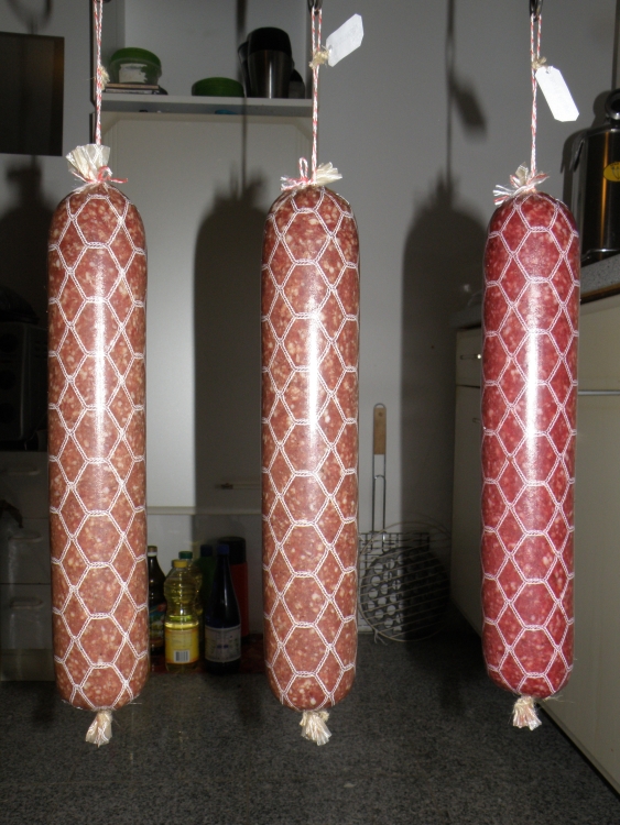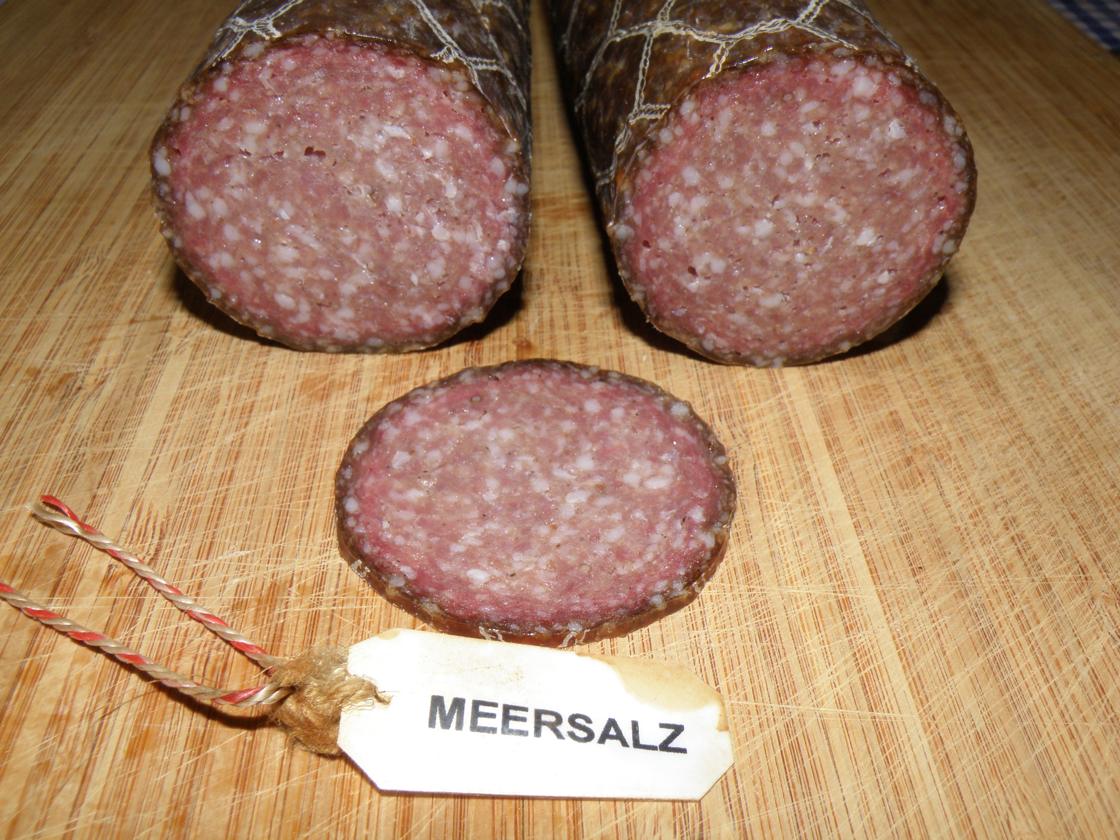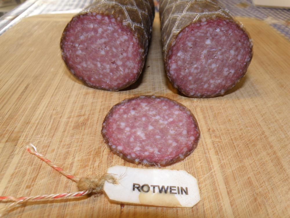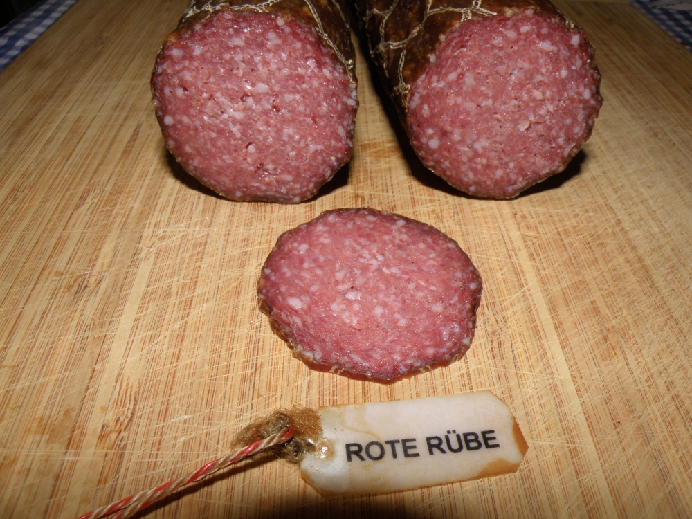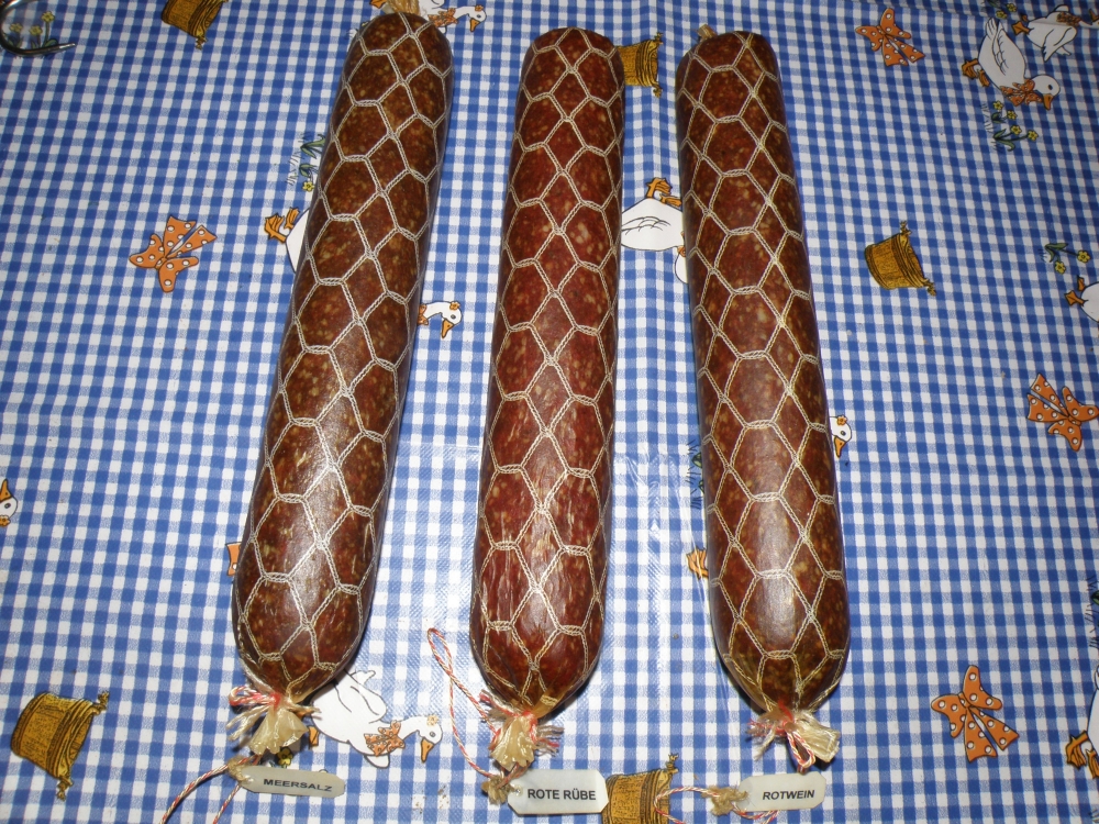 Здравствуйте, как то делал эксперимент с салями, делал салями с морской солью, с красным вином и с свеклой. Все колбасы без нитритной соли. Результат можете оценить сами. Всё измельчение как всегда на мясорубке. Сделал три палки, Созревание при 75% +13°C без копчения.