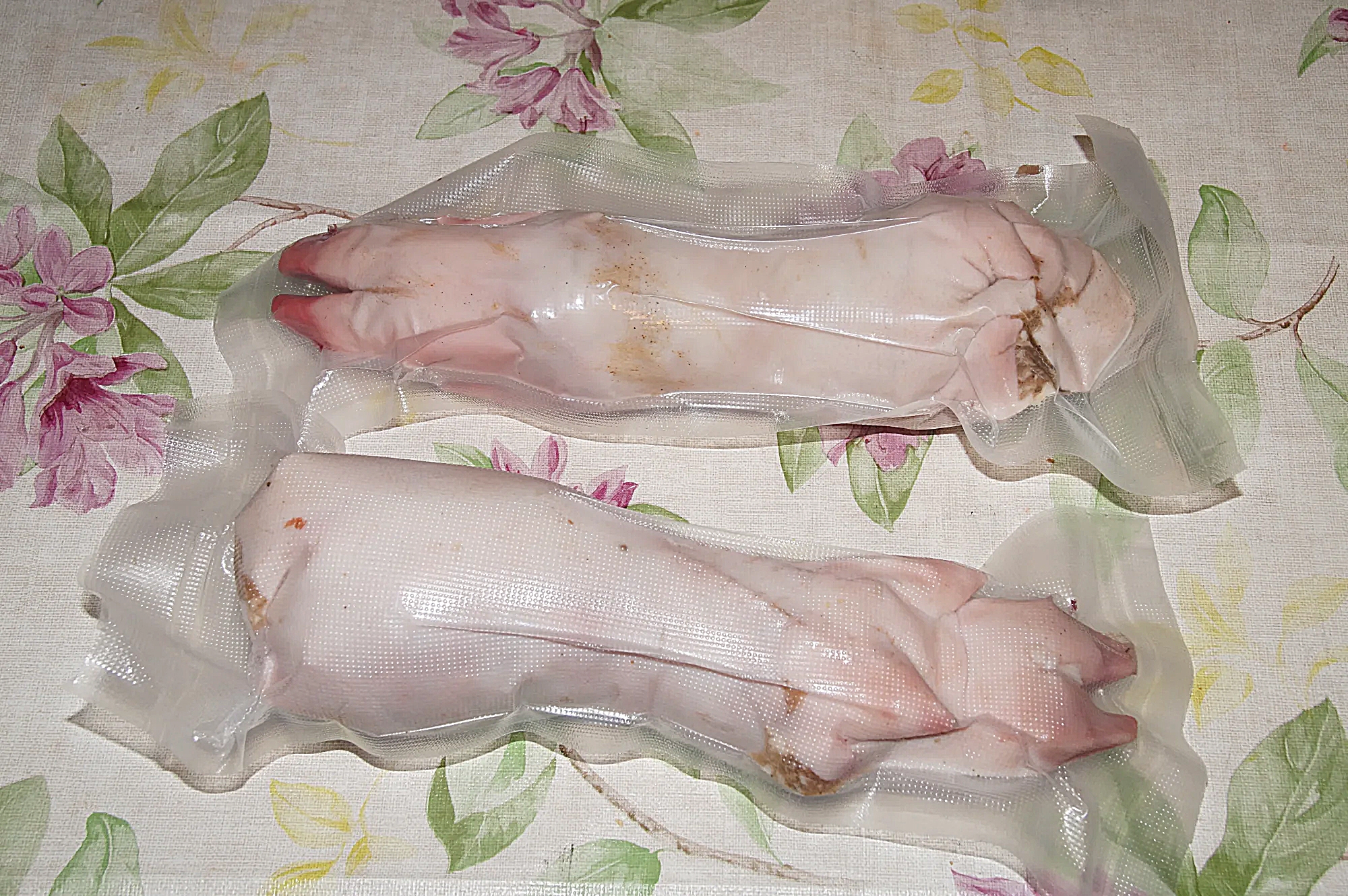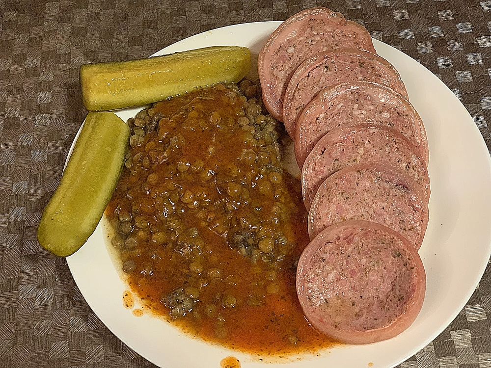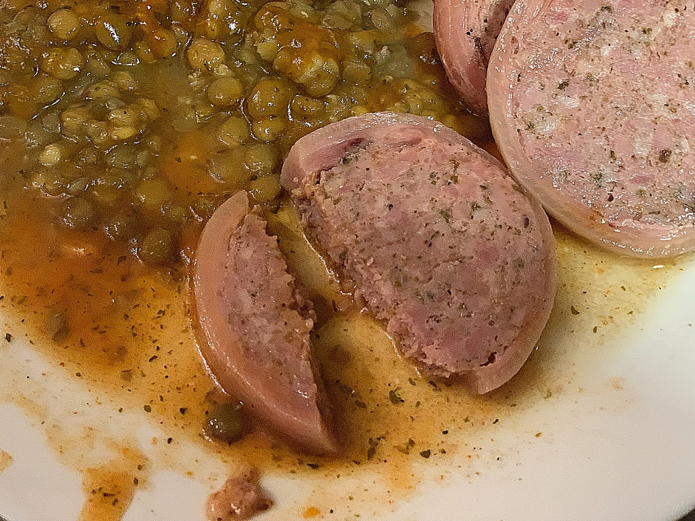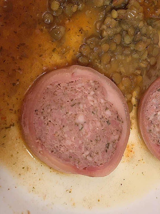 Привет, давно хотел сделать Zampone. Но у меня возникали мысли как удалить кости. Очень важно выбрать нож, нож должен быть тонкий и длиный. Вся работа заняла мното времени. Я покупал ноги в Метро, в упаковке было 6 ног, но я взял только две. Остальные пустил на холодец. Правда ноги были порезаны,не знаю почему они это дклают. Пришлось зашивать, тоже время даиглу надо специальную. Ну ладно всё сделал. Потом набил ноги фаршем. Завакуумировал в вакеты и сварил. Рецепт: Привет! Я давно хотела приготовить зампоне. Это довольно трудоемкий процесс, особенно со свиными ножками. На приготовление двух ножек, включая сшивание, у меня ушло около часа. Рецепт, все ингредиенты в граммах на килограмм мяса: Свиная шея 800 г Свиная грудинка 800 г Свиная шкурка 700 г Соль для засолки 20 г Черный перец 3 г Мускатный орех 1 г Кинза 1 г Паприка 3 г Мазис 1 г Горчичная мука 2 г Сахар 5 г Майоран 3 г Гвоздика 0,5 г Отварите шкурку до мягкости, дайте остыть и измельчите на решетке с размером ячейки 2 мм. Нарежьте мясо на кусочки и измельчите на решетке с размером ячейки 6 мм. Смешайте все ингредиенты и начините ножки и оболочки. Готовьте при 80°C в течение 40 минут. Также мне захотелось сделать итальянское блюдо c чечевицей, сделал очень вкусно.