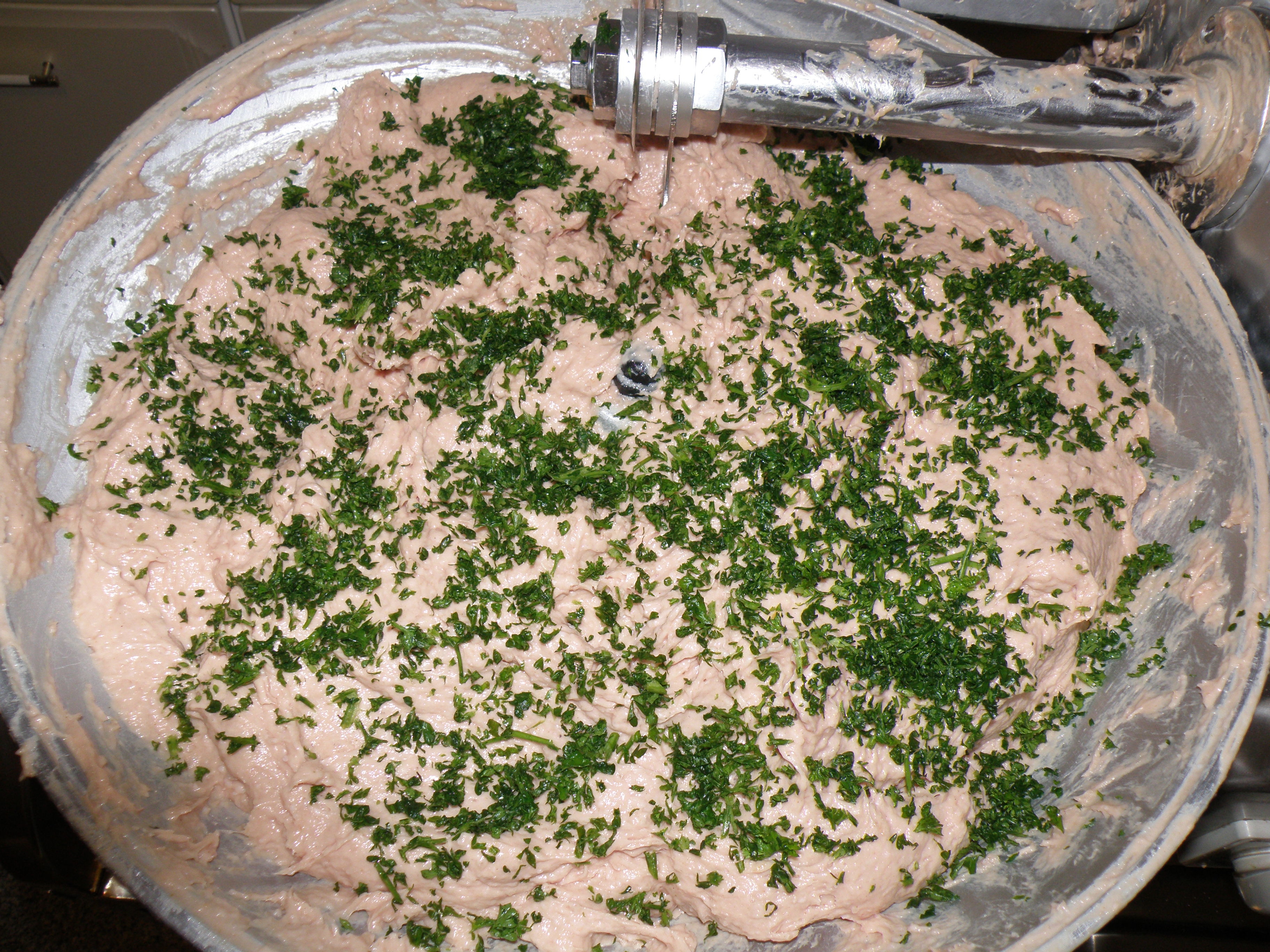 Привет всем, давно ничего здесь не выставлял и вот что то захотелось показать мои творения. Вчера делал печёночную колбасу, она называется по немецки Gutsleberwurst очень вкусная колбаса. Колбаса мажется на хлеб и на завтрак как раз само то. Если кому интересно рецепт Рецепт: Мясо: Свиная печень 1,2 кг Свиная голова Обрезки от каре 1 кг Грудинка 1 кг Пряности в граммах на килограмм мяса: Нитритная соль 20 г Перец белый 3 г Мускатный орех 0,5 г Душистый перец 0,5 г Тимьян 1 г Гвоздика 0,2 г Лук 30 г И приготовление Сначала я мясо сварил при 85 град. один час. Печень порезал на кусочки и замочил в молоке чтобы вытянуть горечь. Лук пожарил до золотистого цвета. Варёное мясо разделал и порезал, шкурку с головы и жирную часть отделил. Сначала пропустил печень и жареный лук пропустил через решётку 2 мм. жир и шкурку тоже пропустил через через решётку 2 мм. Оставшееся мясо пропустил через решётку 6 мм. Добавил пряности всё хорошо перемешал, потом добавил жирный бульон и всё очень хорошо вымесил. Набил в гузенку и перевязал. Колбасу варил при 75 град. один час.