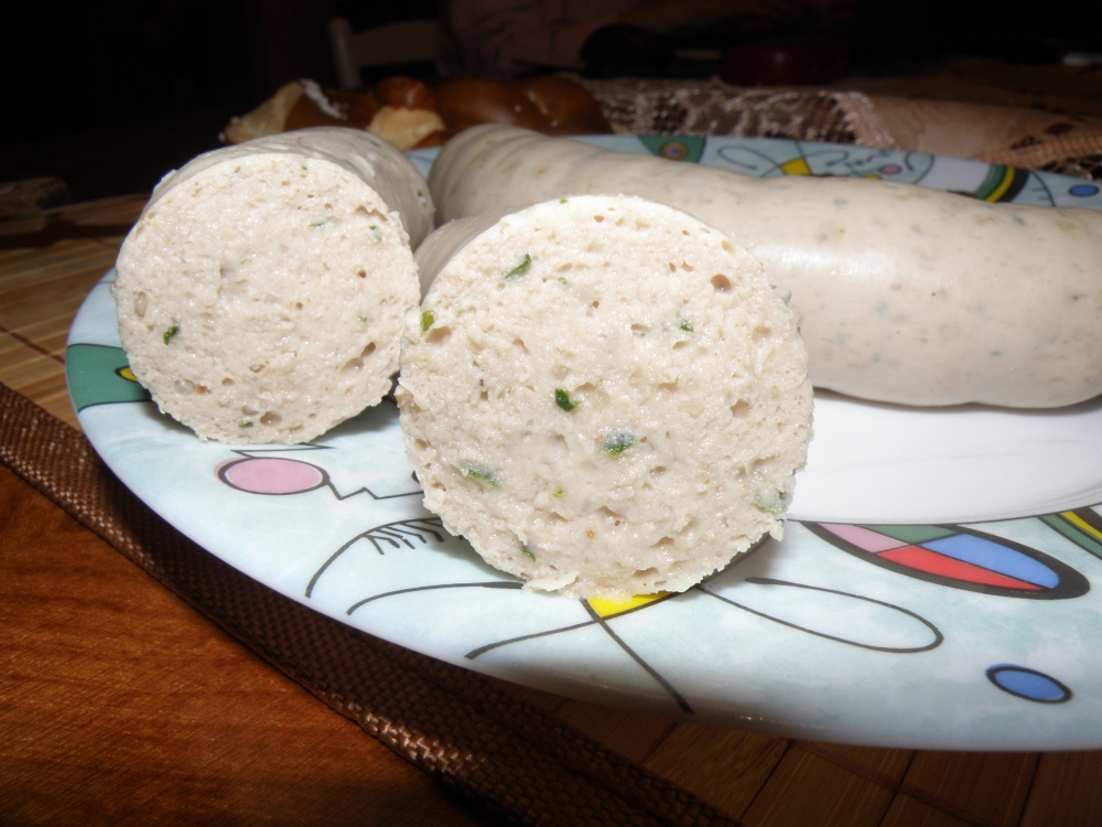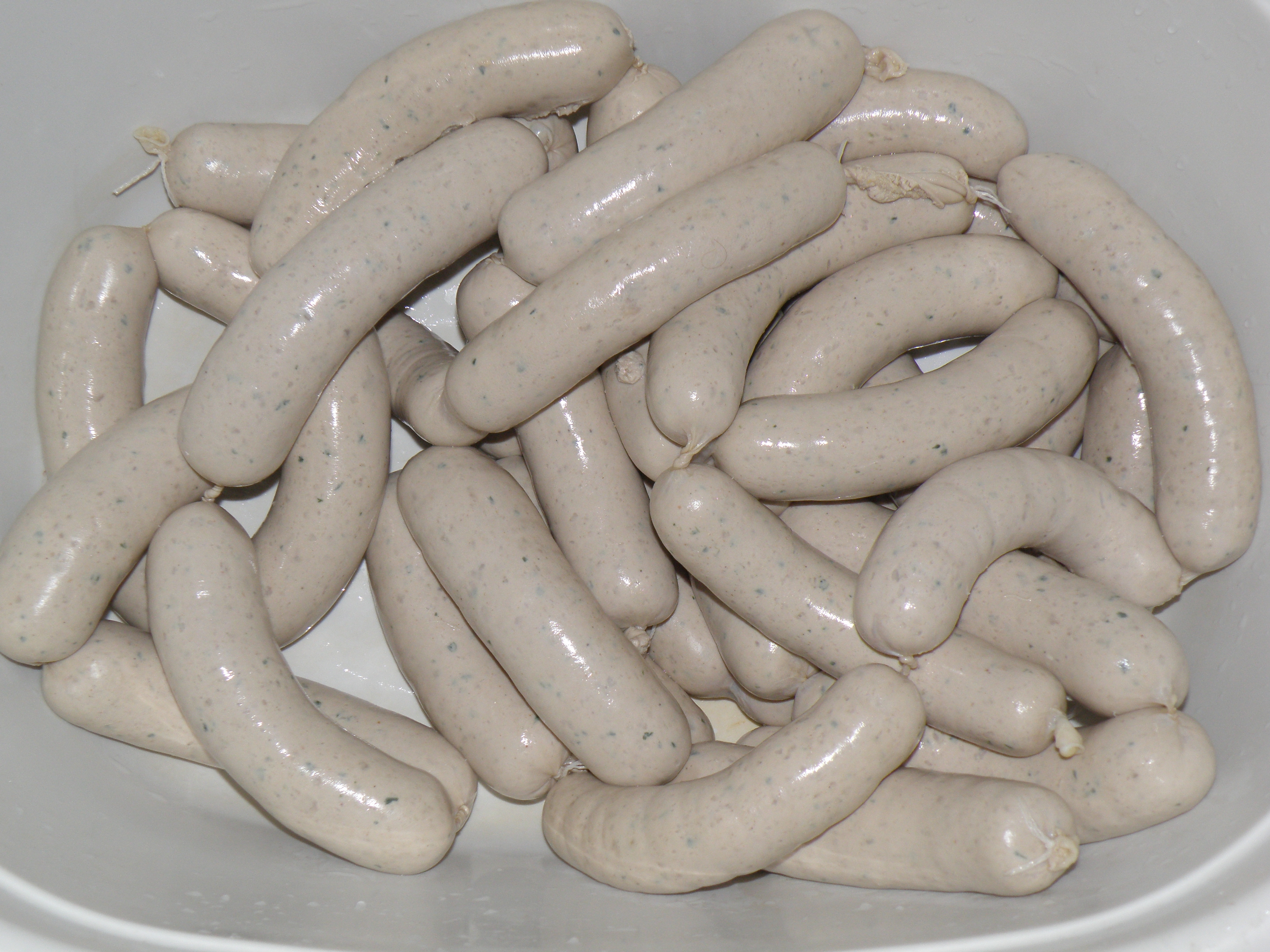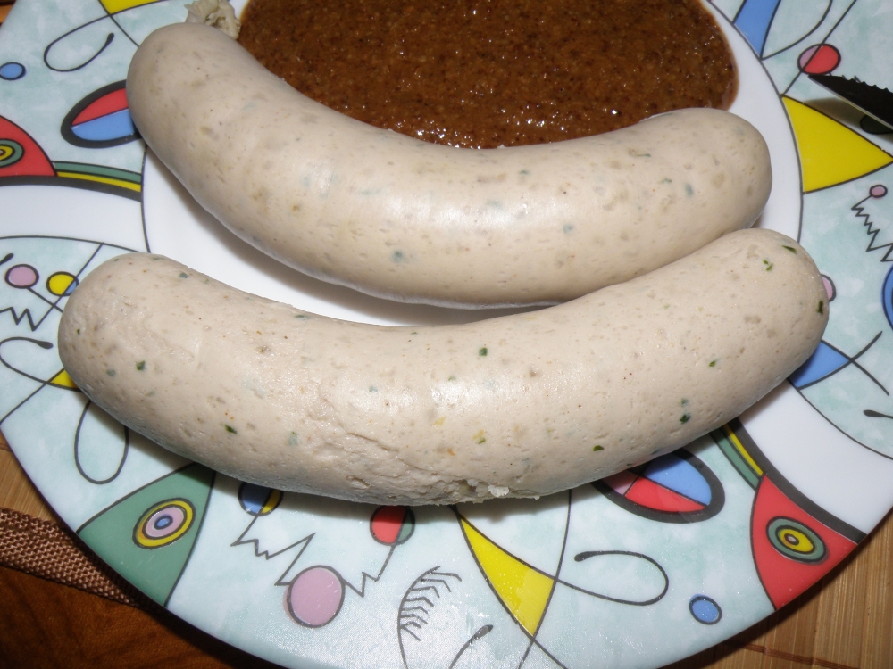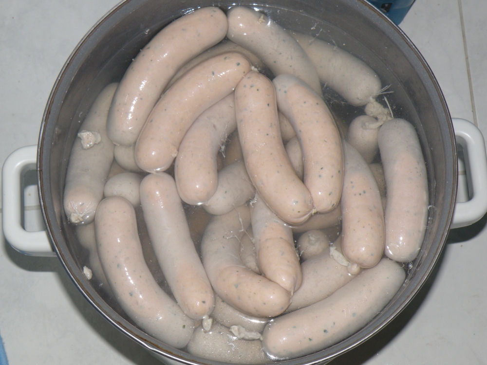 В баварии существут традиция Мюнхенские белые колбаски можно есть только до 12 часов, позже нельзя. Я очень люблю эти колбаски с тёмным пшеничным пивом. Делаю иногда сам. В оригинально рецепте обязательно долна быть телятина. К белым колбаскм обязательно принадлежит бретцель. Рецепт Мясо Телятина 1900 г Свиная щека 600 г Спинной бекон 500 г Тушеная свиная шкурка 200 г - эмульсия Снег 300-400г Специи в граммах на килограмм мяса Соль 18 -20 г Фосфат 4-5г Белый перец 6 г Душистый перец 0,6 г Мацис 1г Имбирь 1 г Кардамон 0,9 г Тертая лимонная цедра 3 г Петрушка порезаная 200 -300г