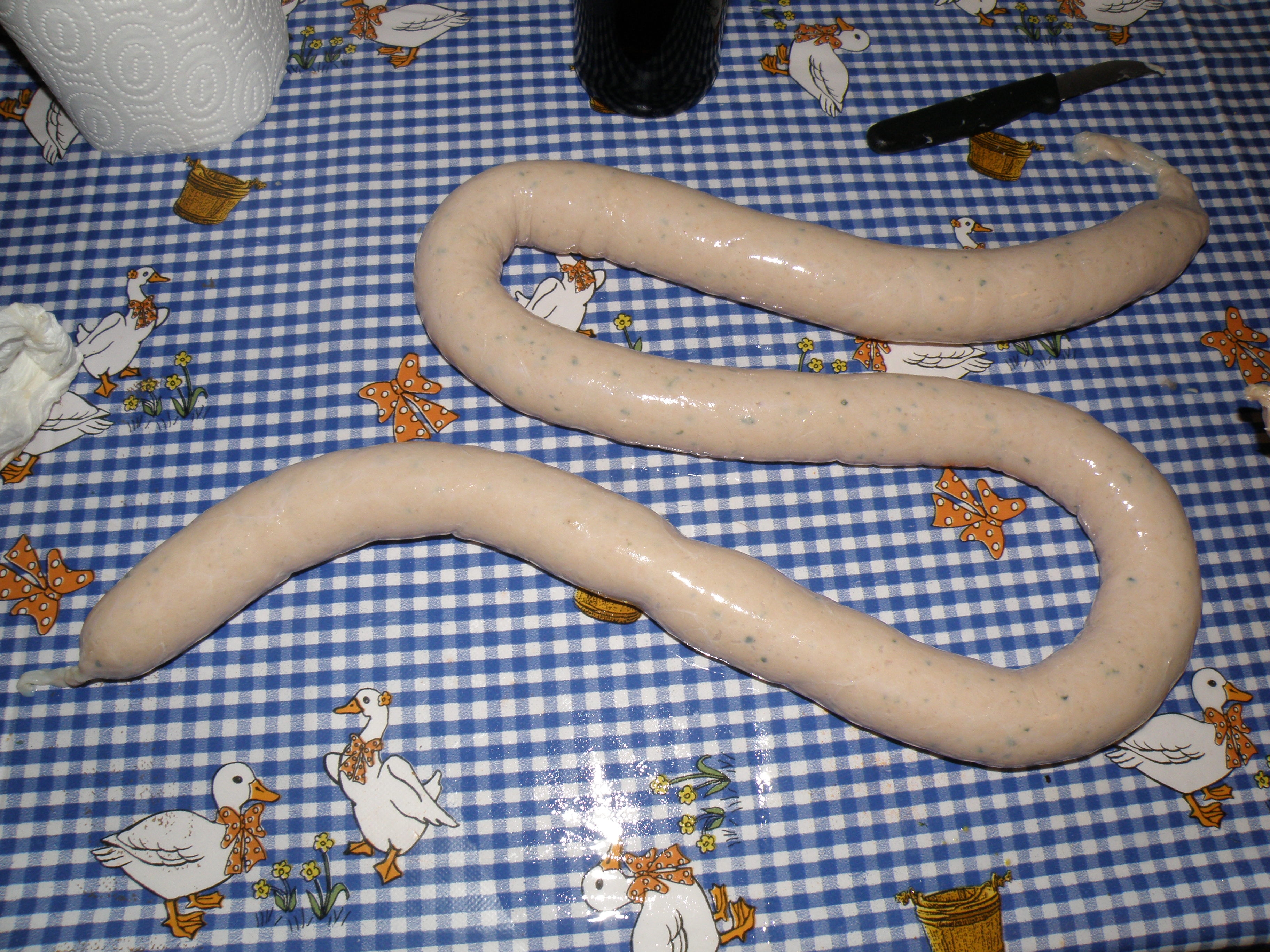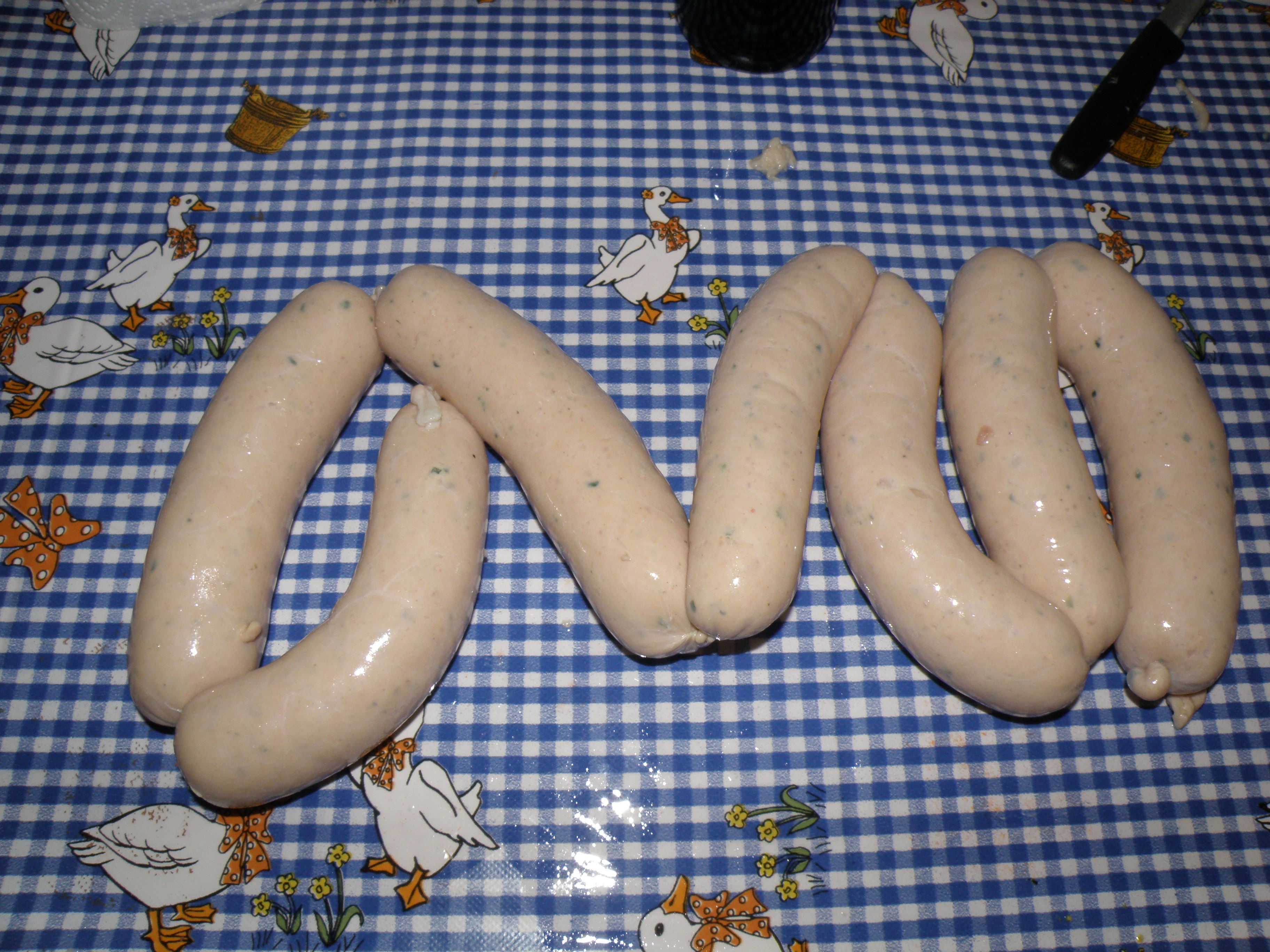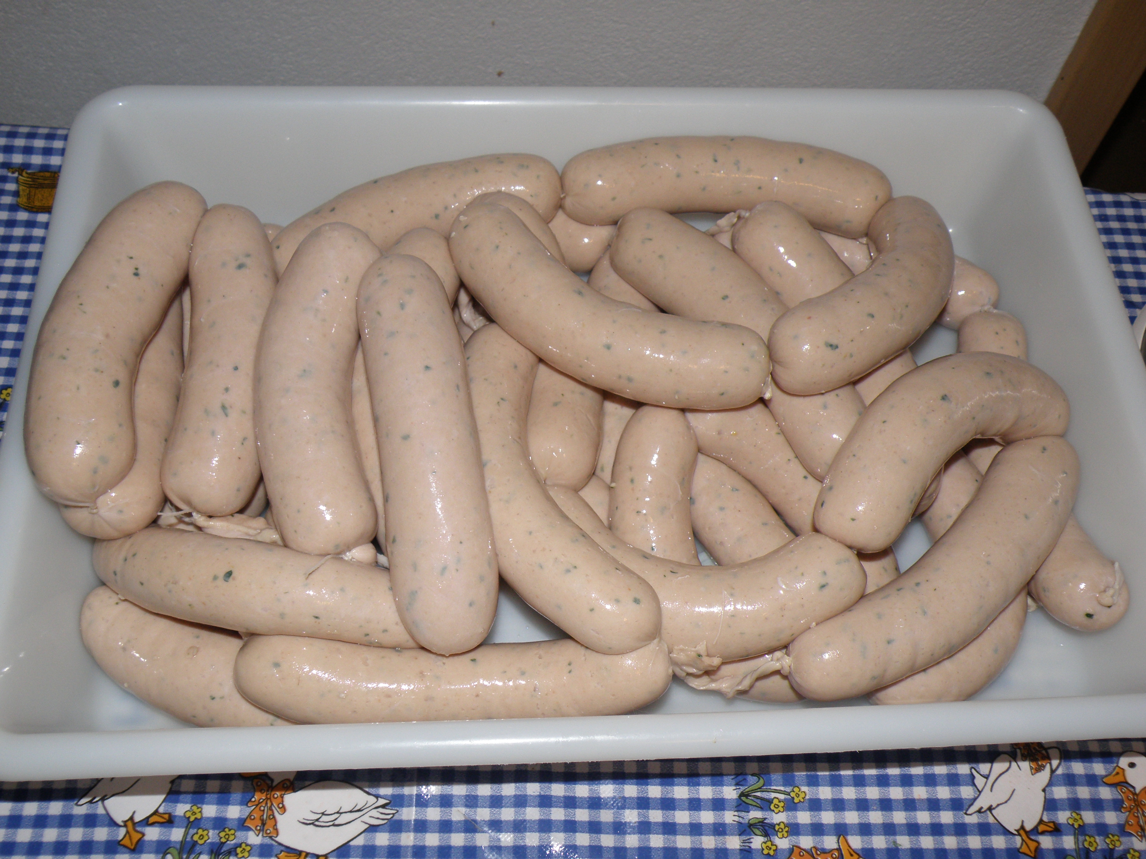 В баварии существут традиция Мюнхенские белые колбаски можно есть только до 12 часов, позже нельзя. Я очень люблю эти колбаски с тёмным пшеничным пивом. Делаю иногда сам. В оригинально рецепте обязательно долна быть телятина. К белым колбаскм обязательно принадлежит бретцель. Рецепт Мясо Телятина 1900 г Свиная щека 600 г Спинной бекон 500 г Тушеная свиная шкурка 200 г - эмульсия Снег 300-400г Специи в граммах на килограмм мяса Соль 18 -20 г Фосфат 4-5г Белый перец 6 г Душистый перец 0,6 г Мацис 1г Имбирь 1 г Кардамон 0,9 г Тертая лимонная цедра 3 г Петрушка порезаная 200 -300г