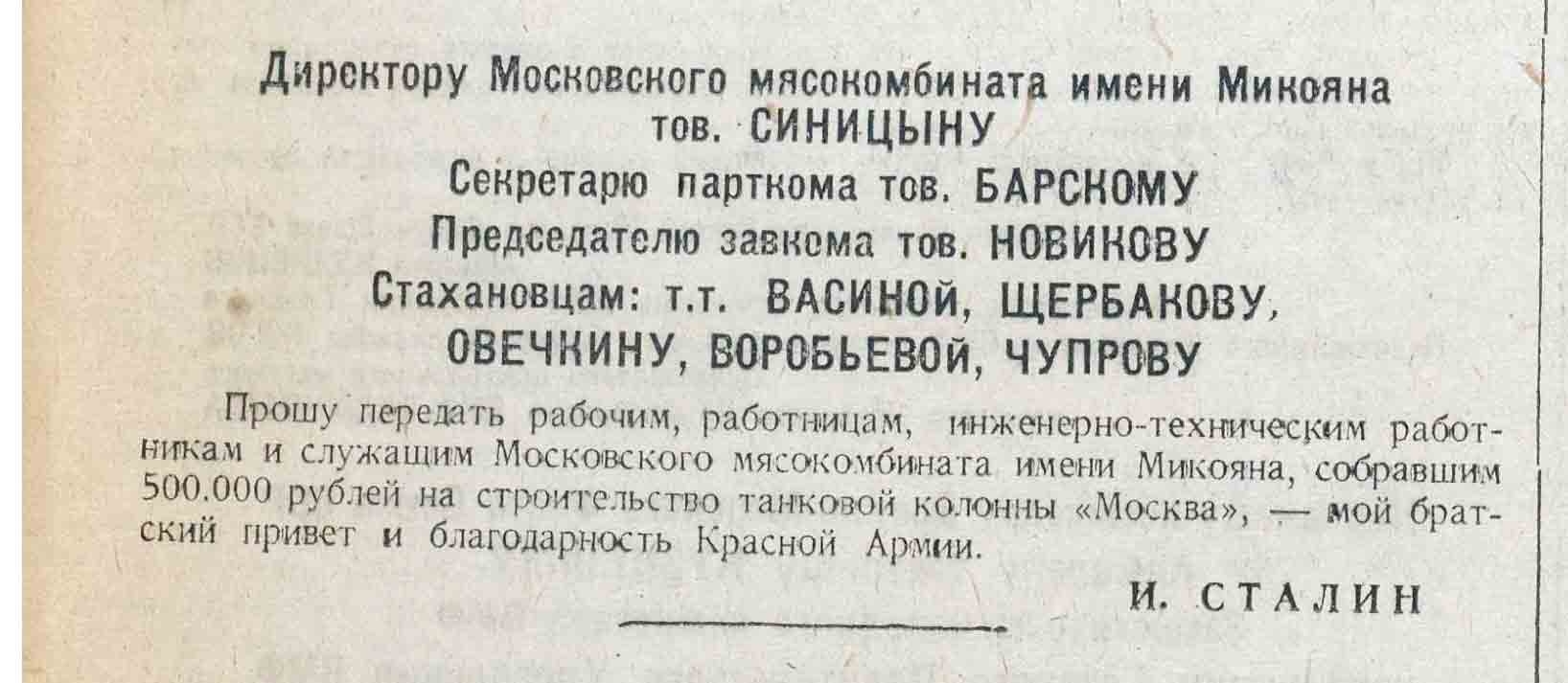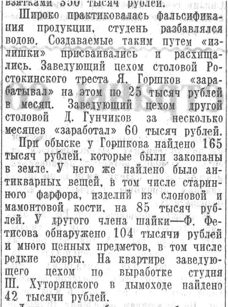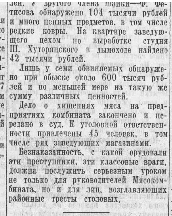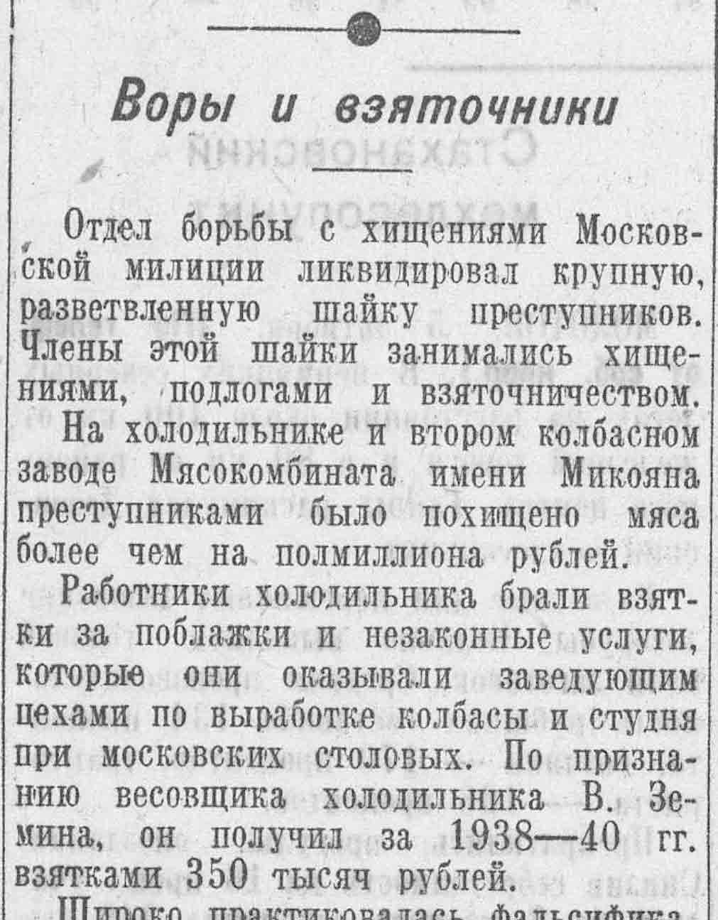 Читаем газету Известия от 1940 года в которой описывается воровство и взяточничество в системе Московского мясокомбинате им Микояна на холодильнике и на 2-ом колбасном. Студень, к примеру разбавляли водой, а излишки сырья воровали и продавали. К слову, еще раз подчеркнем: Земин за 2 года получил взятками 350 тысяч советских рублей, Гунчиков - 60 тысяч, Горшков - 165 тысяч + 85 тысяч, Фетисов 104 тысячи, Хуторянский 42 тысячи. Итого только из перечисленного в статье более 800 тысяч рублей. К уголовной ответственности привлечены 45 человек! Для примера цен в те времена: 10 копеек - стоимость газеты в которой была опубликована эта заметка про воровство. 500 рублей - зарплата начальника отдела на Московском мясокомбинате в 1938 году Работники Микояновского мясокомбината в 1942 году собрали из личных сбережений и передали на танковую колонну "Москва" 500 тысяч рублей. Цены на технику в довоенном СССР: Трактор "СТЗ" за 6000 рублей Автомобиль "ГАЗ-АА" за 7500 рублей Газета "На защиту Родины", 1942, № 84 (1111) публикует цены на военную технику: Один самолет в среднем стоит полмиллиона рублей, танк 200 тысяч рублей, орудие-50 тысяч рублей. P.S, Виновных наказали. Кого расстреляли, кого посадили. Нескольких оправдали.