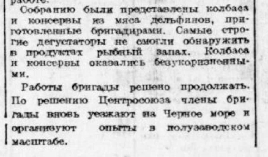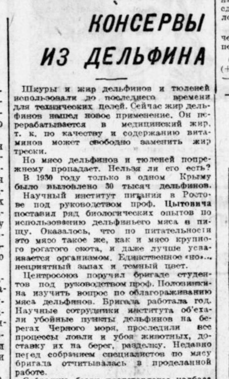 В интернете много различной информации про переработку дельфинов. Давайте поставим историческую точку - что такая практика была. Просто как факт. ВЕЧЕРНЯЯ МОСКВА 8 ПЯТНИЦА ИЮНЯ 1934 г. No 130 (3159) Цена 10 коп. 30 год - выловлено 50 тысяч дельфинов. Масштаб понимаете?
