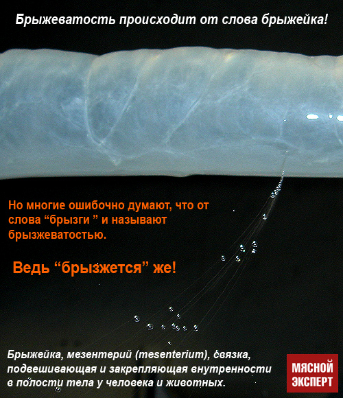 Главный технолог Опубликовано 15 марта, 2010 Жалоба Опубликовано 15 марта, 2010 БРЫЖЕВАТОСТЬ НАТУРАЛЬНОЙ ОБОЛОЧКИБРЫЖЕВАТОСТЬ происходить от слова БРЫЖЕЙКА.Ничего общего с "брызгами" и с тем, что оболочка "брызжется", "брызгается" и прочее. Не имеет.Брыжейка, мезентерий (mesenterium), связка, подвешивающая и закрепляющая внутренности в полости тела у человека и животных. Брыжеватость бывает на свиной и бараньей (козьей) череве.Все очень просто - когда происходит отрыв кишки от брыжейки могут образовываться мельчайшие разрывы - дырочки.Величина дырочек определяет степень брыжеватости.К примеру согласно ТУ 9218-884-00419779-05 «Кишки бараньи и козьи обработанные» размер брыжеватости дает возможность сортировать оболочку по категориям качества. Сразу оговорюсь, что это не единственный параметр при оценке категории качества.Пыльная брыжеватость - это когда при наполнении водой оболочки с нее течет - а дырочек не видно. Это допускается на категории "А". Эта категория подойдет под жидкие фарши к примеру "Молочных" сосисок. Фарш вытекать из оболочки не будет.Брыжеватость 0,5 мм - имеется ввиду, что фонтанчик воды имеет диаметр 0,5 мм. Это категория "В".Брыжеватость 1,5 мм - Категория "С".Категория "В" и "С" подойдут для структурных фаршей - типа "Охотничьих колбасок", где фарш не будет вытекать через дырочки.