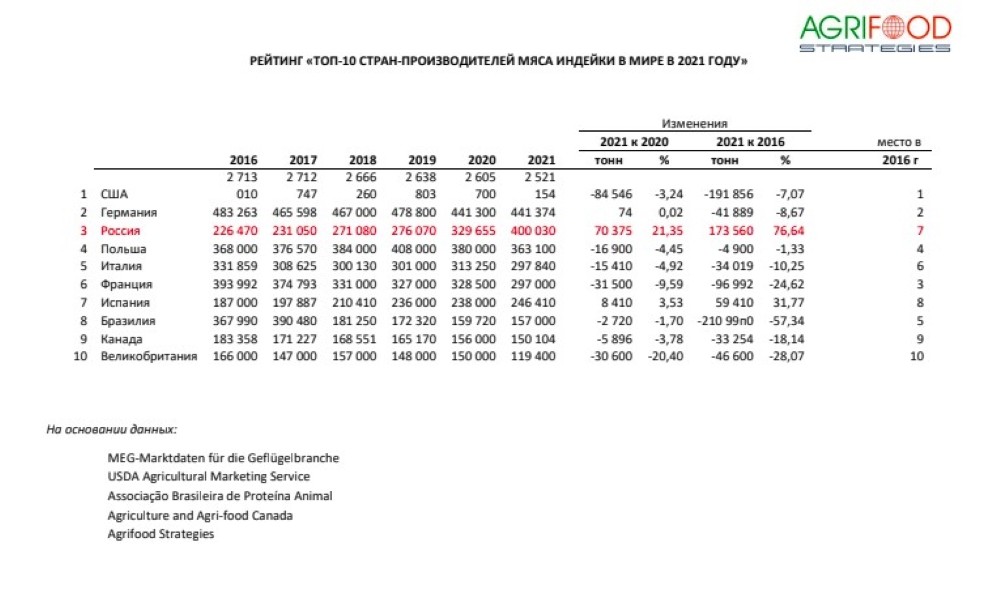 Консалтинговое агентство Agrifood Strategies сообщает, что по итогам 2021 года Россия признана третьим в мире производителем мяса индейки после США и Германии и вторым в Европе с общим объемом производства более 400 тысяч тонн. При уточнении данных учитывались операционные результаты всех категорий хозяйств.