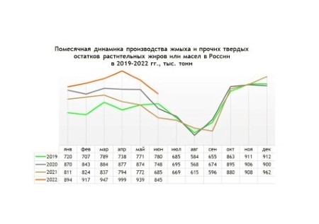 В июне объем выпуска продуктов второй из названных категорий составил 845 тысяч тонн, что на 10% ниже показателя за май текущего года, но на 23% выше, чем в июне 2021-го. Если проследить динамику производства кормовой продукции из отходов прессования семян масличных культур за четыре года, то четко прослеживается сезонность: в летний период объем падает.